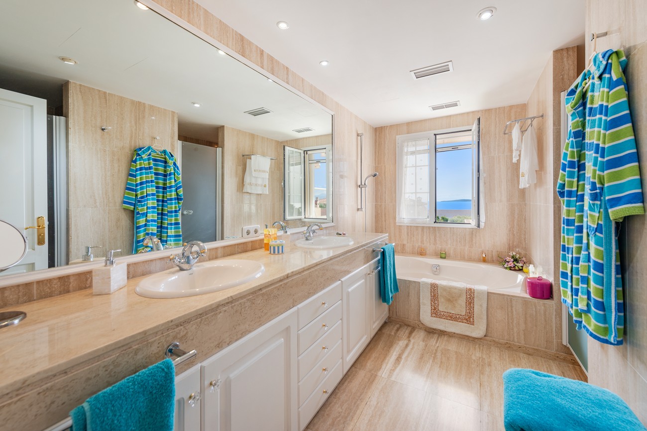 Op de eerste verdieping zijn drie slaapkamers en drie en suite badkamers, waaronder de master suite met kleedkamer en een privéterras met uitzicht op zee.