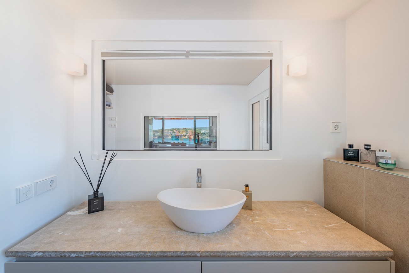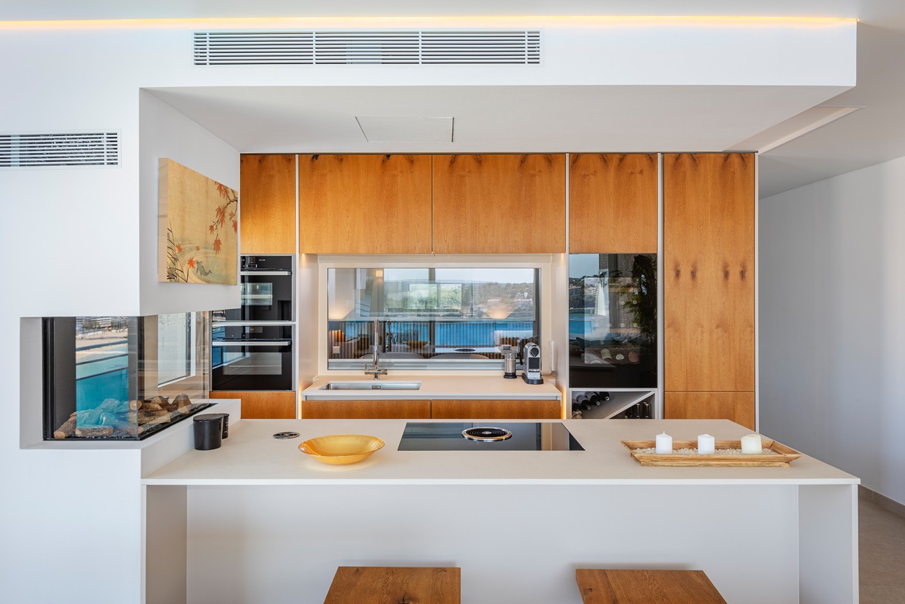 De open woon-, eet- en keukenruimte heeft een open haard en een wijnkoelkast, allemaal met panoramisch uitzicht. De hoofdslaapkamer heeft grote ramen die het scheiden van de badkamer, zodat je vanuit elke kamer uitzicht hebt op zee, plus directe toegang tot een balkon met extra opslagruimte en natuurlijk licht. Twee extra slaapkamers delen een badkamer.