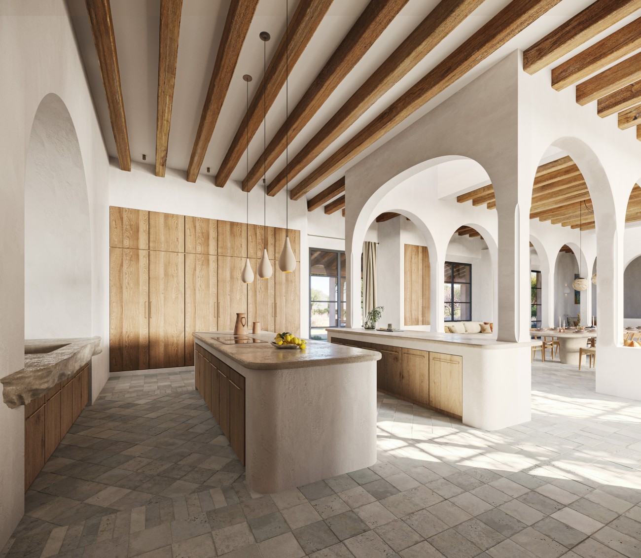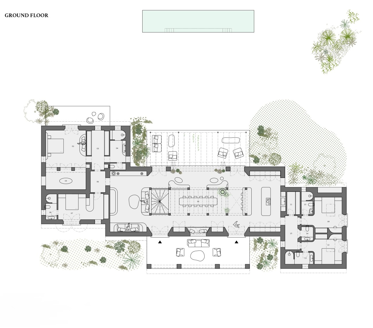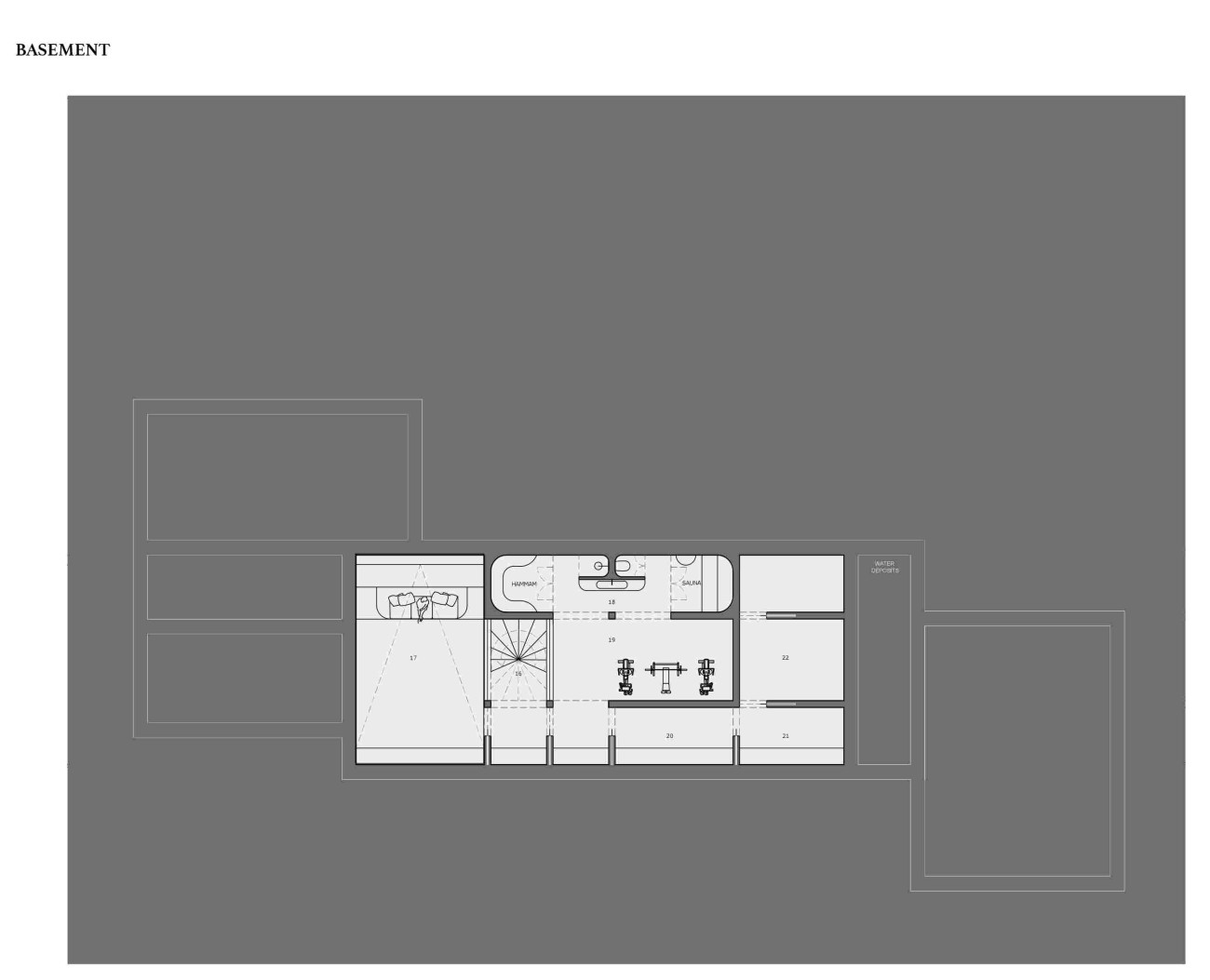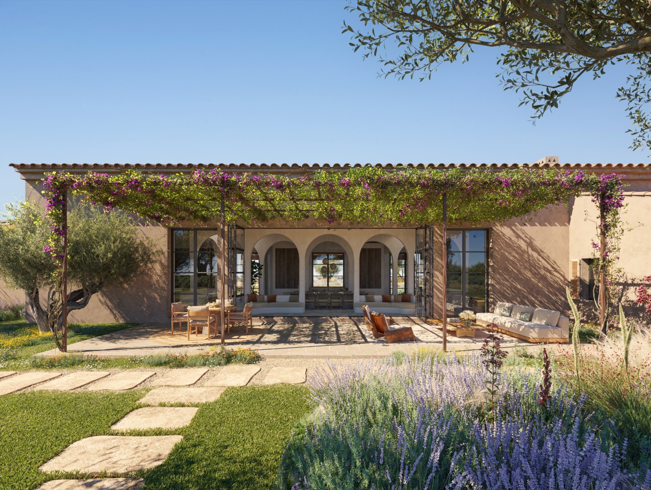 Het project voorziet in een gelijkvloerse finca van 585 m², inclusief een ruime kelder met speciale ruimtes voor een spa, fitnessruimte en thuisbioscoop.