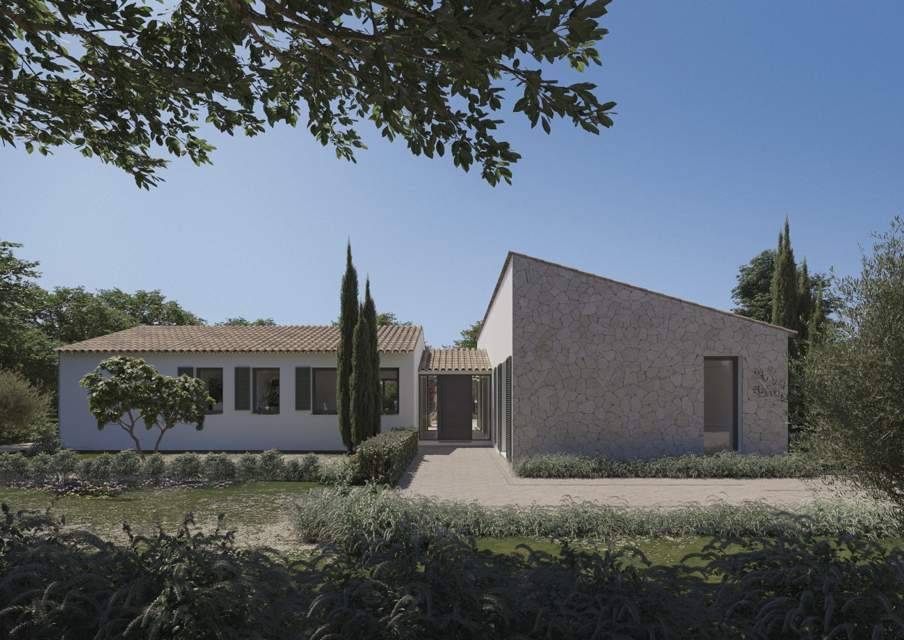 Het perceel wordt verkocht met een volledig goedgekeurd basisproject en bouwvergunning, zodat de bouw zonder vertraging kan beginnen. De geplande finca biedt ongeveer 414 m² bebouwd oppervlak, allemaal ontworpen op één niveau voor comfortabel en praktisch wonen. De indeling omvat drie ruime slaapkamers, elk met een eigen en-suite badkamer, een gastentoilet en een lichte open woon- en eetruimte verbonden met een moderne keuken met extra opslagruimte.