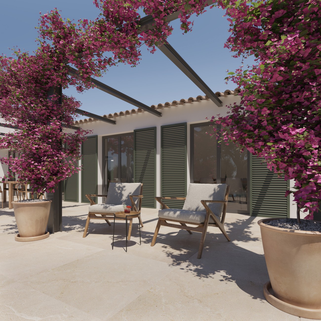 Grote openingen leiden vanuit de woonkamer naar een royaal terras en een privézwembad van 30 m², waardoor een naadloze binnen-buiten levensstijl ontstaat die ideaal is om het hele jaar door te genieten van het klimaat op Mallorca. Het ontwerp combineert klassieke Mallorcaanse architectuur met hedendaagse elementen en bevat moderne smart-home technologie voor comfort en efficiëntie.