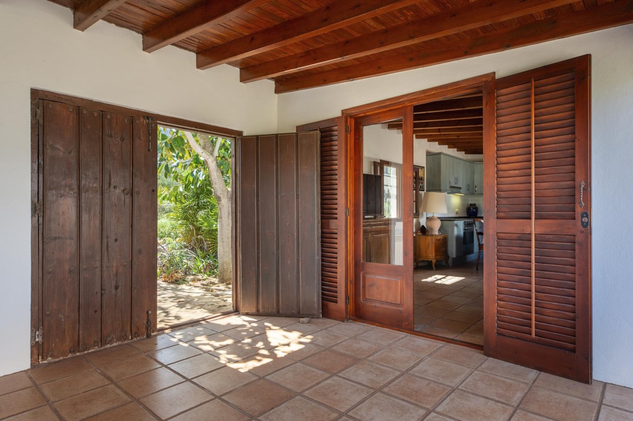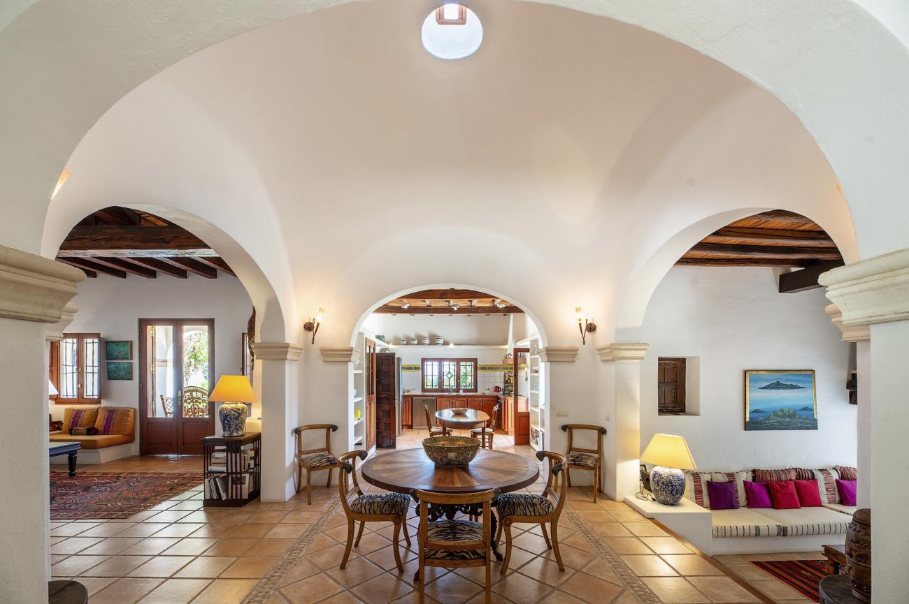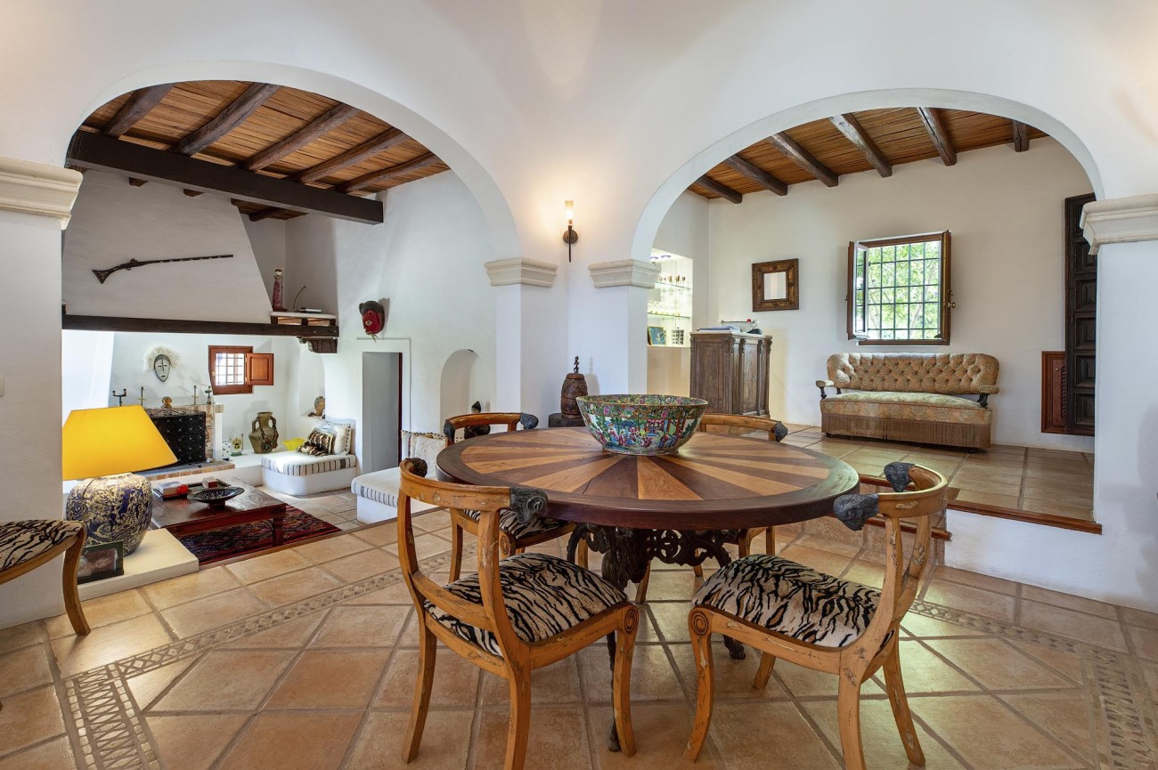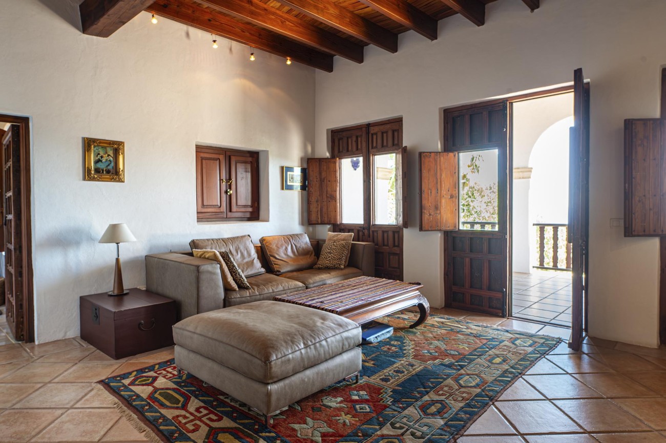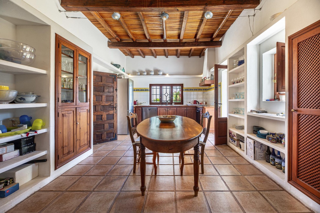 Het hoofdgebouw is een prachtige finca-stijl villa met karakter, met ruime kamers verdeeld over verschillende niveaus. Hoge plafonds met houten balken, rustieke stenen bogen en massief houten deuren in het hele huis versterken de traditionele charme. De uitnodigende eetkamer heeft een indrukwekkend gewelfd plafond en creëert een gezellige, uitnodigende sfeer. Terracotta vloeren voegen warmte en authenticiteit toe aan de leefruimtes.