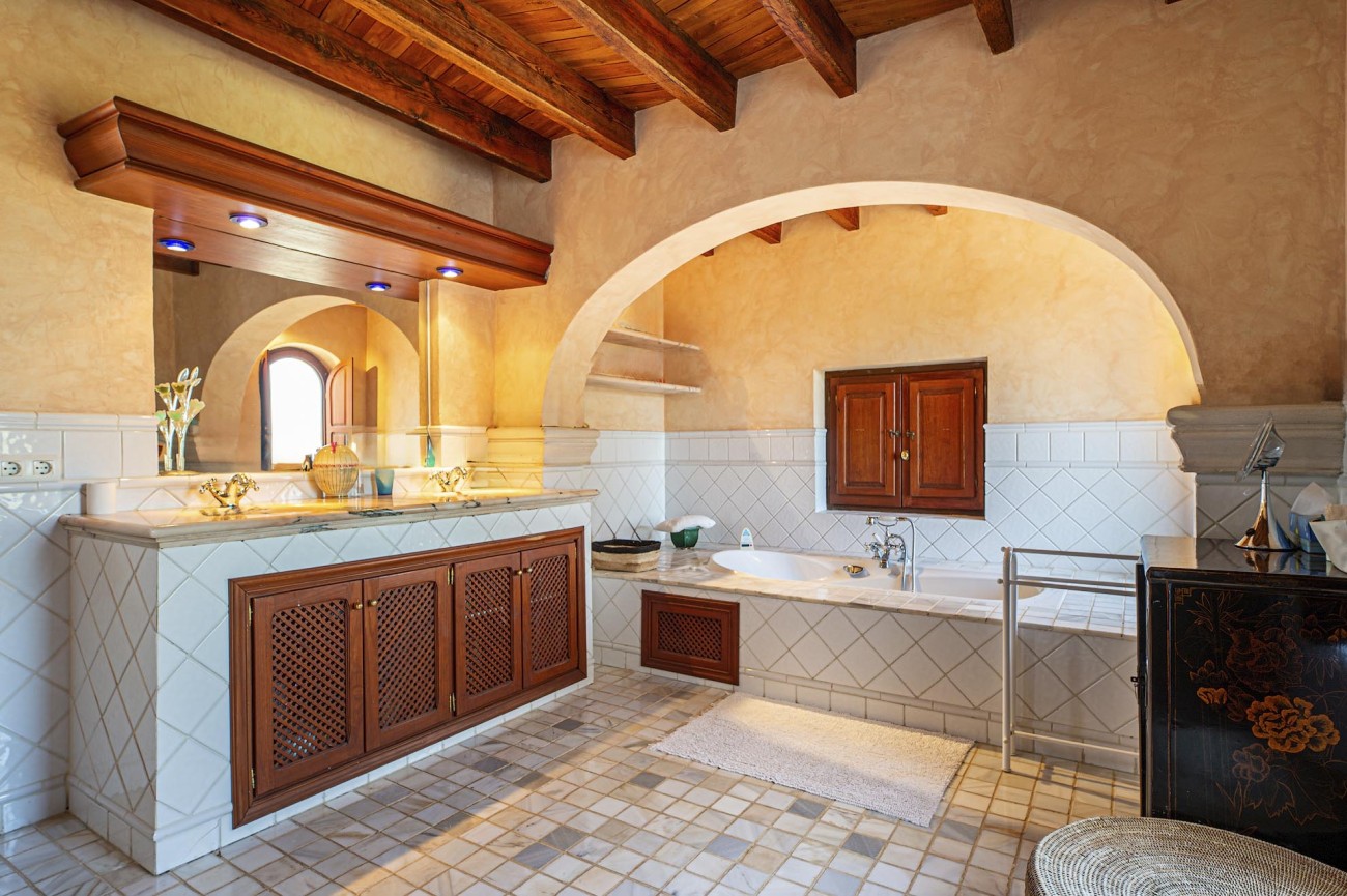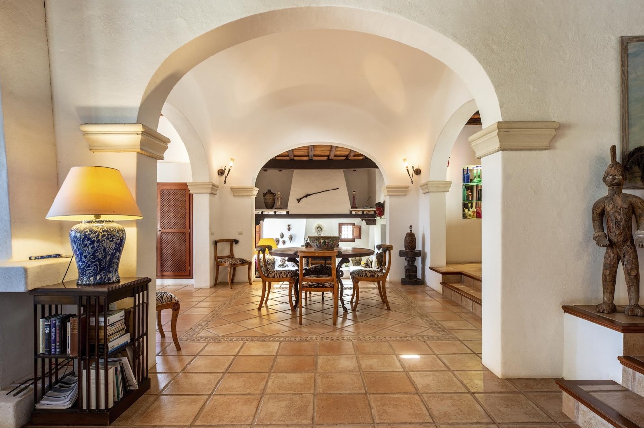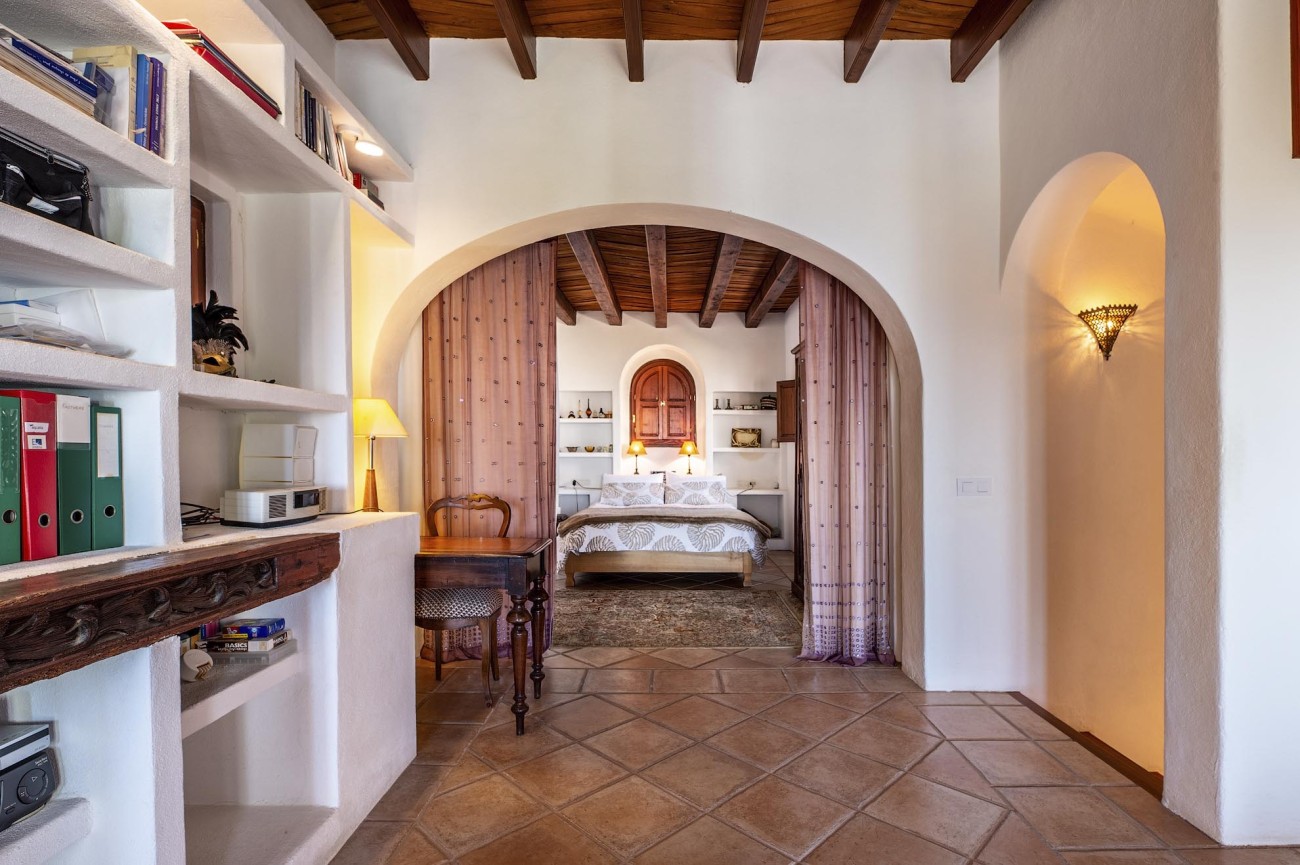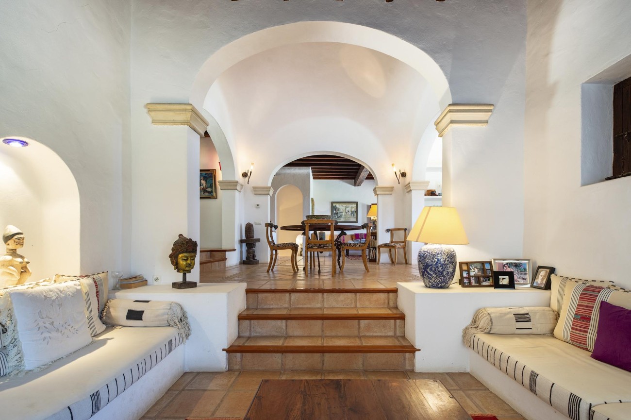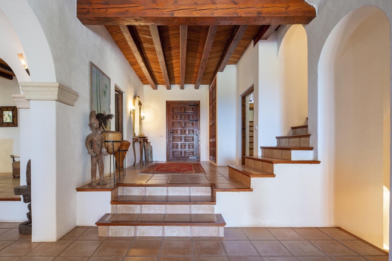 Het hoofdgebouw is een prachtige finca-stijl villa met karakter, met ruime kamers verdeeld over verschillende niveaus. Hoge plafonds met houten balken, rustieke stenen bogen en massief houten deuren in het hele huis versterken de traditionele charme. De uitnodigende eetkamer heeft een indrukwekkend gewelfd plafond en creëert een gezellige, uitnodigende sfeer. Terracotta vloeren voegen warmte en authenticiteit toe aan de leefruimtes.