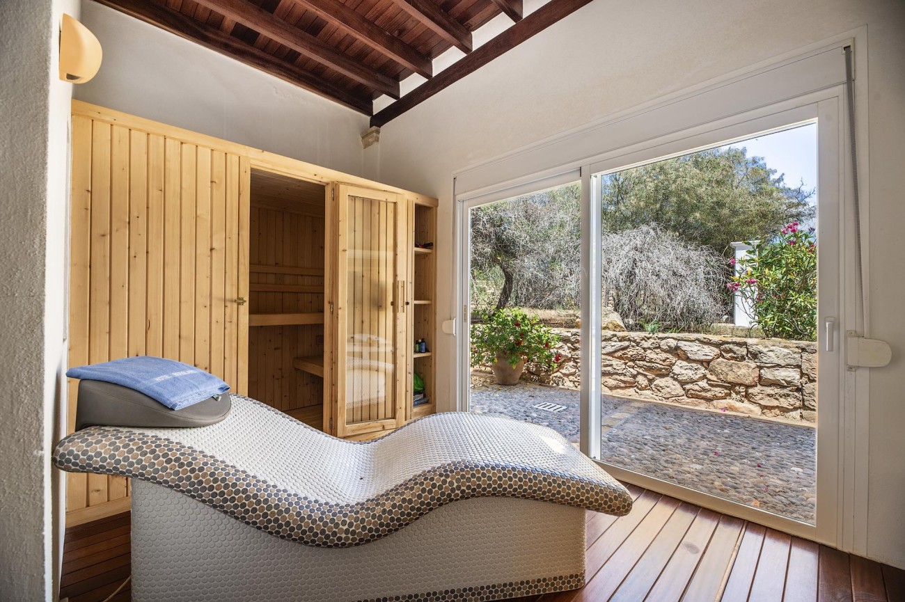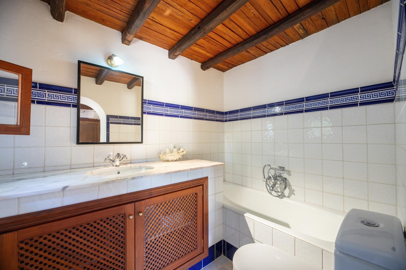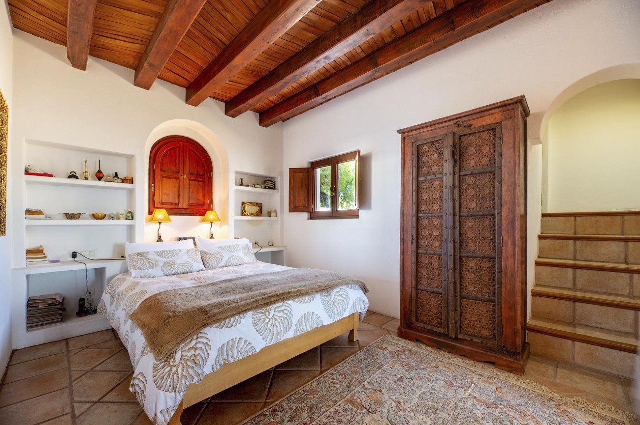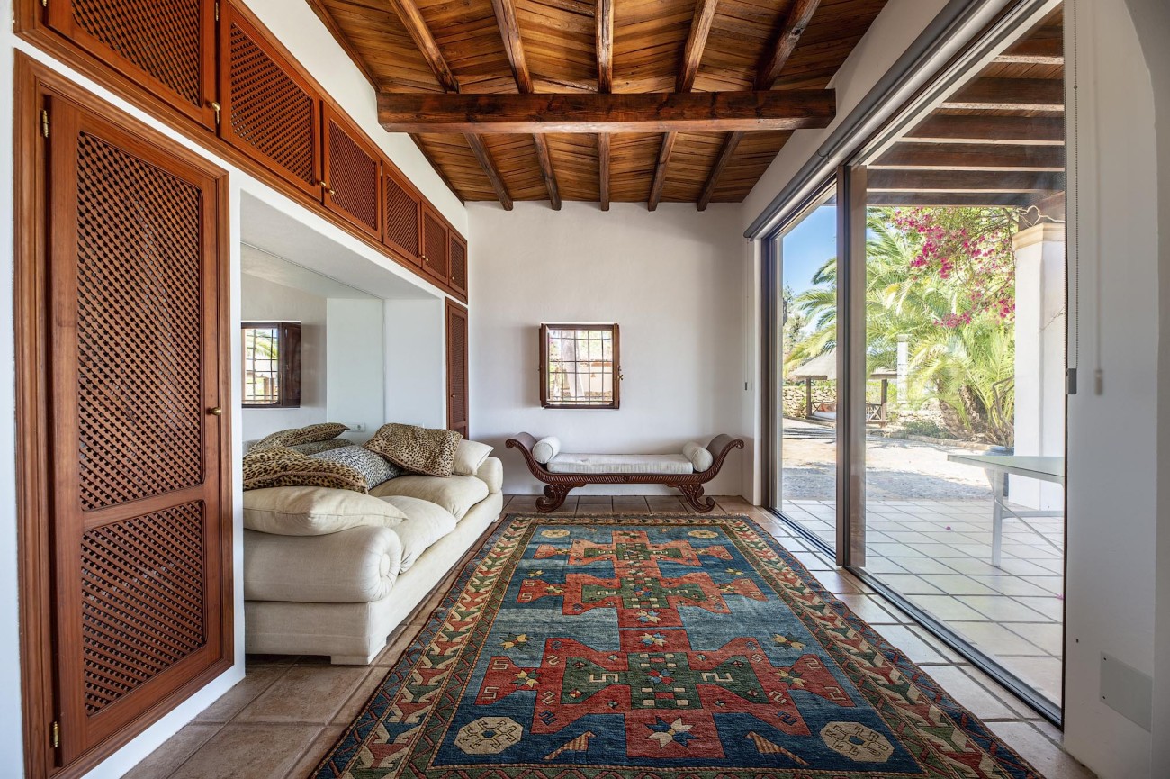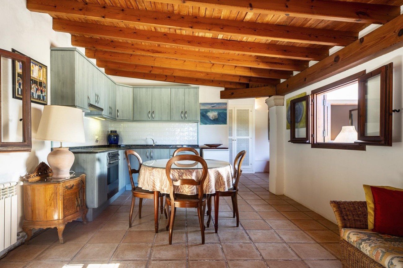 Het hoofdgebouw is een prachtige finca-stijl villa met karakter, met ruime kamers verdeeld over verschillende niveaus. Hoge plafonds met houten balken, rustieke stenen bogen en massief houten deuren in het hele huis versterken de traditionele charme. De uitnodigende eetkamer heeft een indrukwekkend gewelfd plafond en creëert een gezellige, uitnodigende sfeer. Terracotta vloeren voegen warmte en authenticiteit toe aan de leefruimtes.