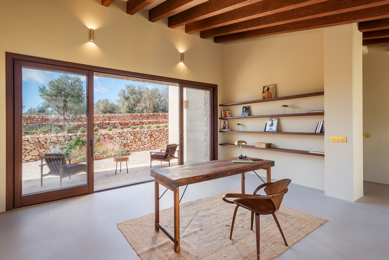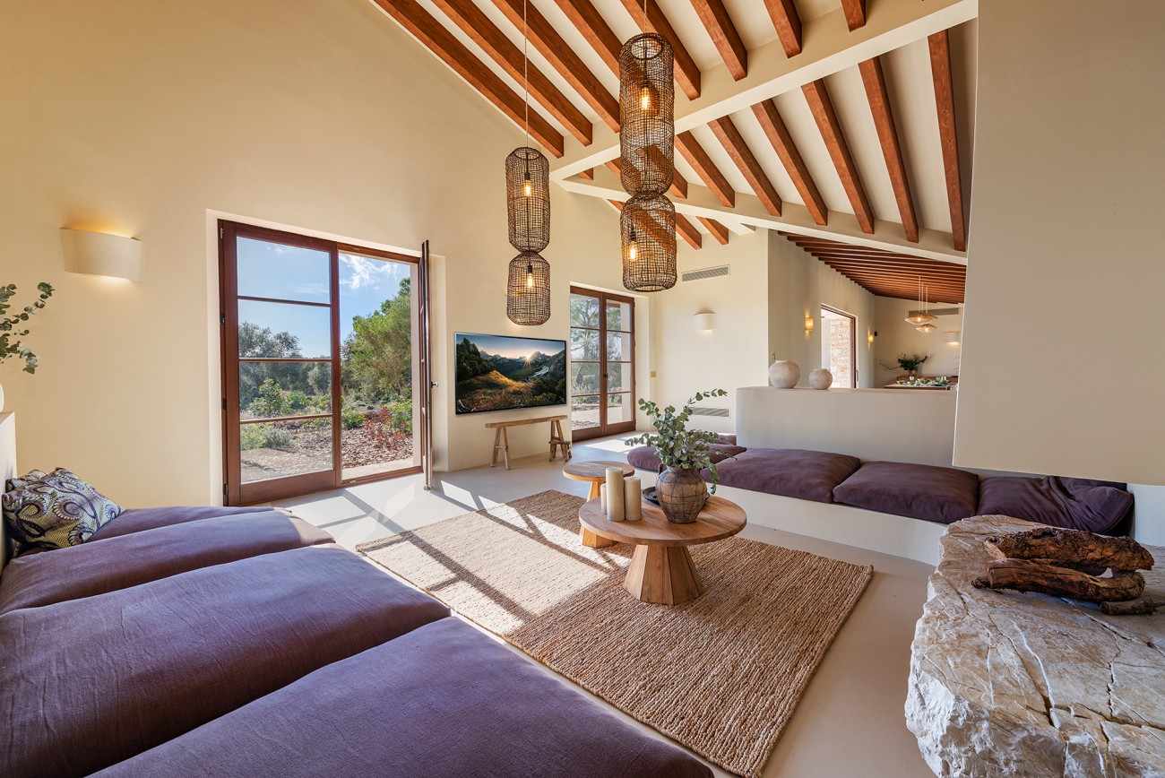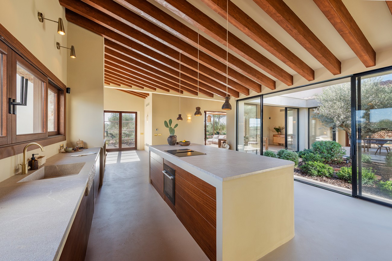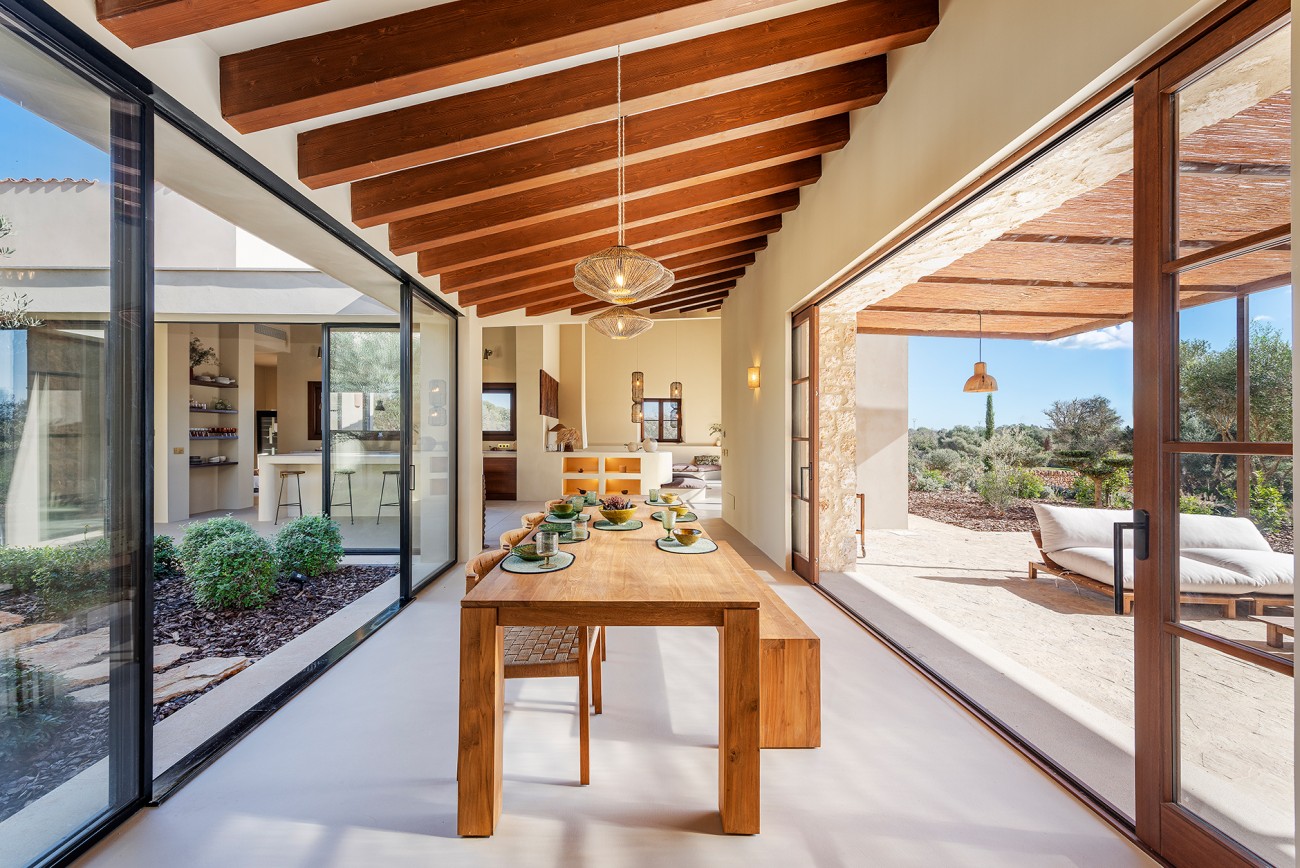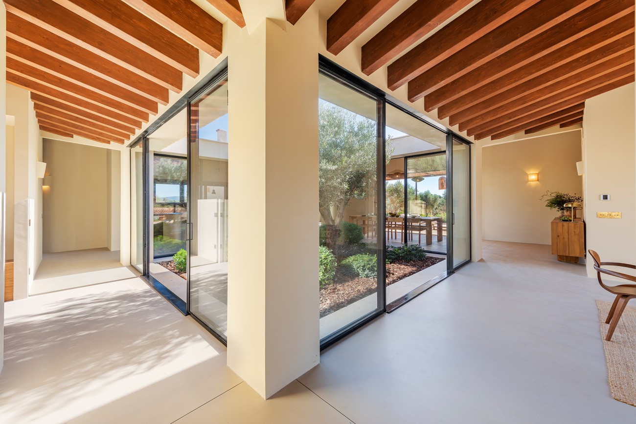 Het hoofdgebouw heeft zes slaapkamers, een open studeerkamer en zes badkamers plus een gastentoilet. De royale woonkamer opent naar een zonovergoten patio die het hart van het huis vormt en de hele dag door voor helderheid zorgt. Hoogwaardige afwerkingen zijn onder andere microcementvloeren, houtskeletramen met dubbele beglazing en een open keuken die is uitgerust met Miele. Vloerverwarming, airconditioning en een open haard zorgen het hele jaar door voor comfort.