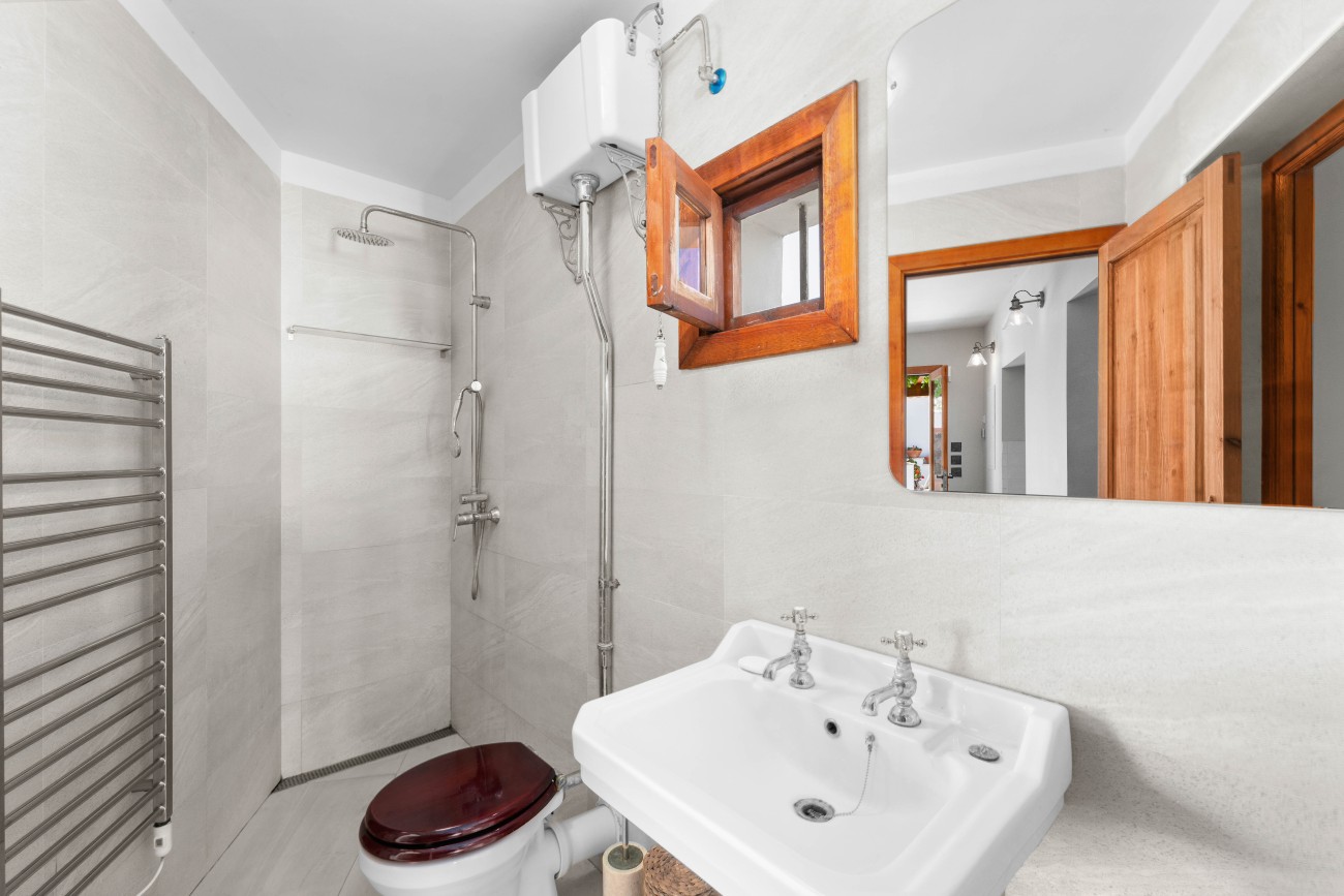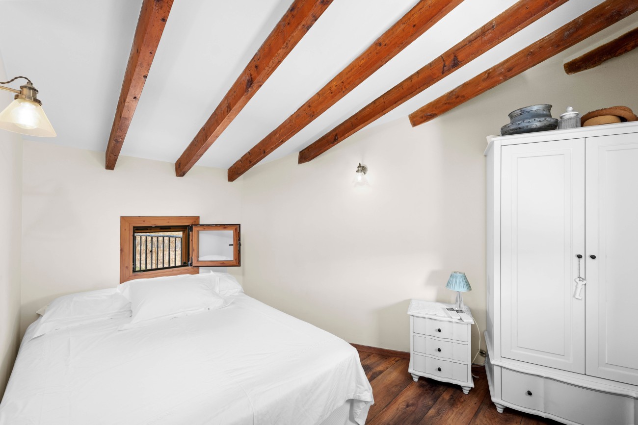 Boven vind je nog twee slaapkamers, waaronder een master suite met toegang tot een groot terras met uitzicht over Port Andratx, perfect om ‘s ochtends van koffie te genieten of ‘s avonds van de zonsondergang. In het hele huis zorgen houten balken, tegelvloeren beneden en houten vloeren boven voor rustieke elegantie, terwijl vloerverwarming op de begane grond zorgt voor comfort in de koelere maanden.