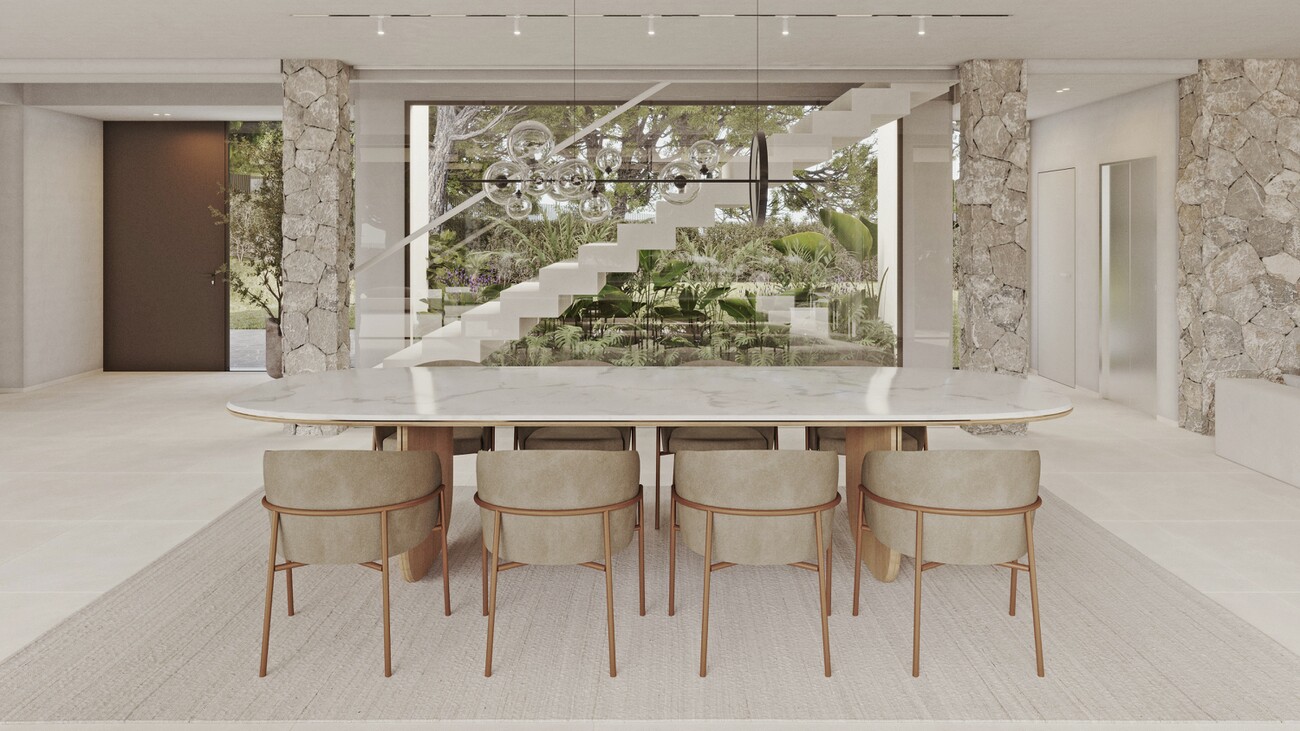 The villa offers four bedrooms and four bathrooms, complemented by a guest toilet, all designed with comfort and functionality in mind. Natural stone flooring runs throughout the home, while the bespoke kitchen is fully equipped with high-end Miele appliances.
