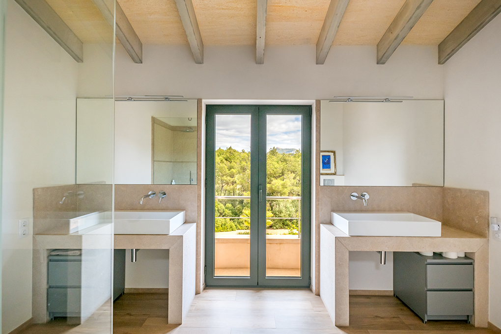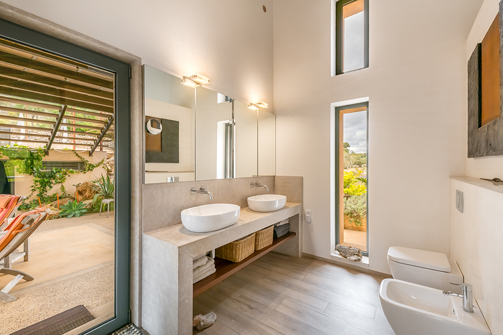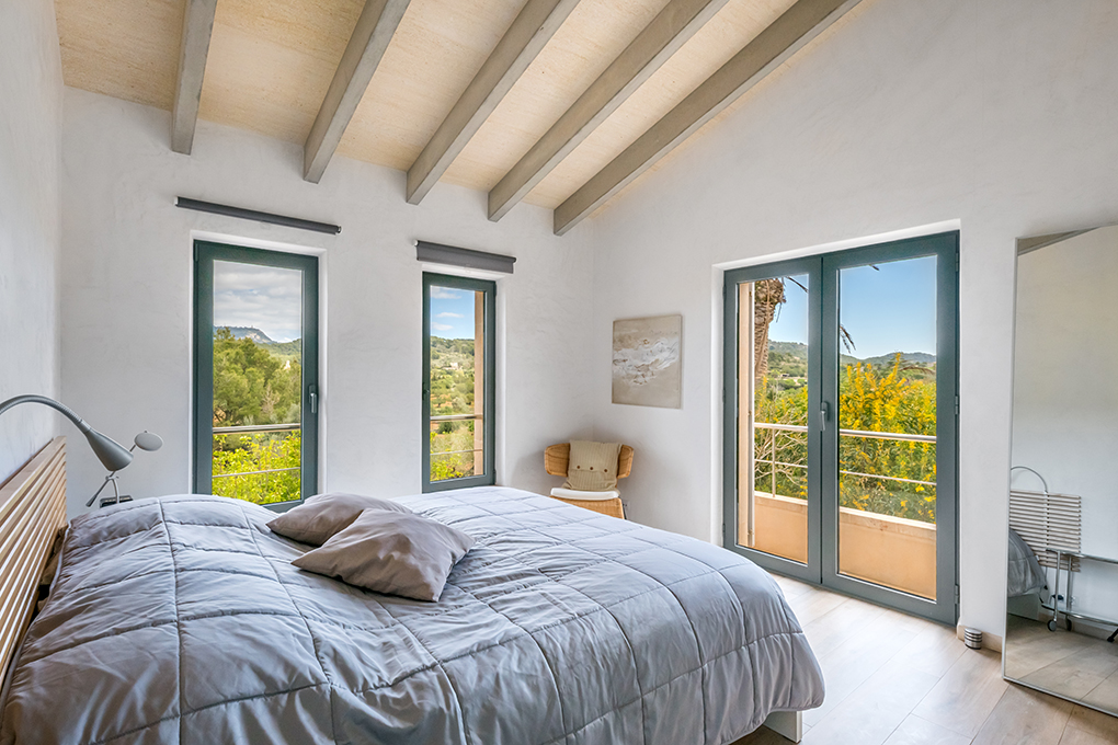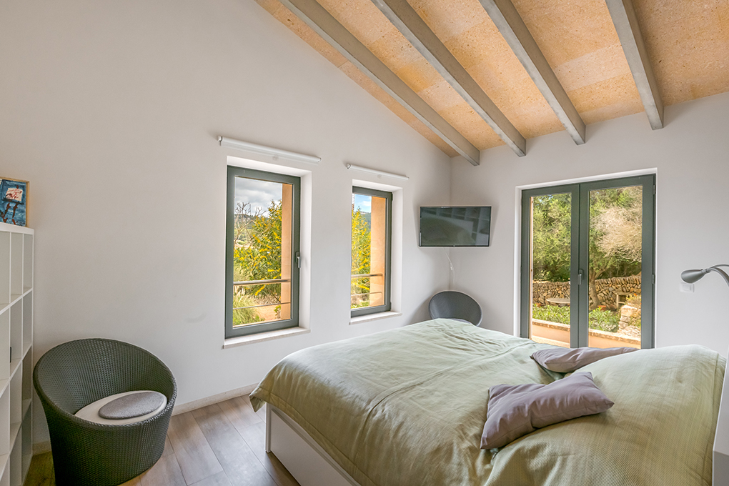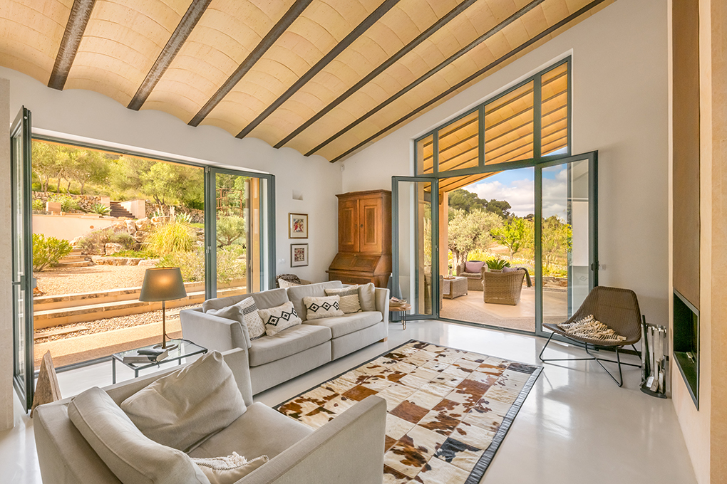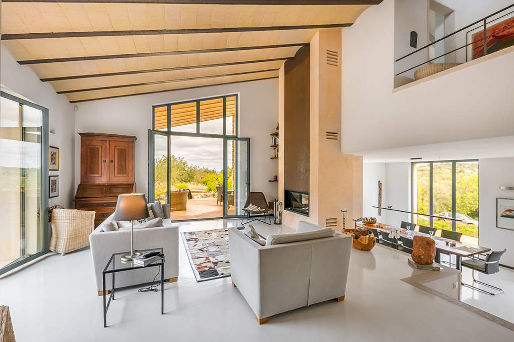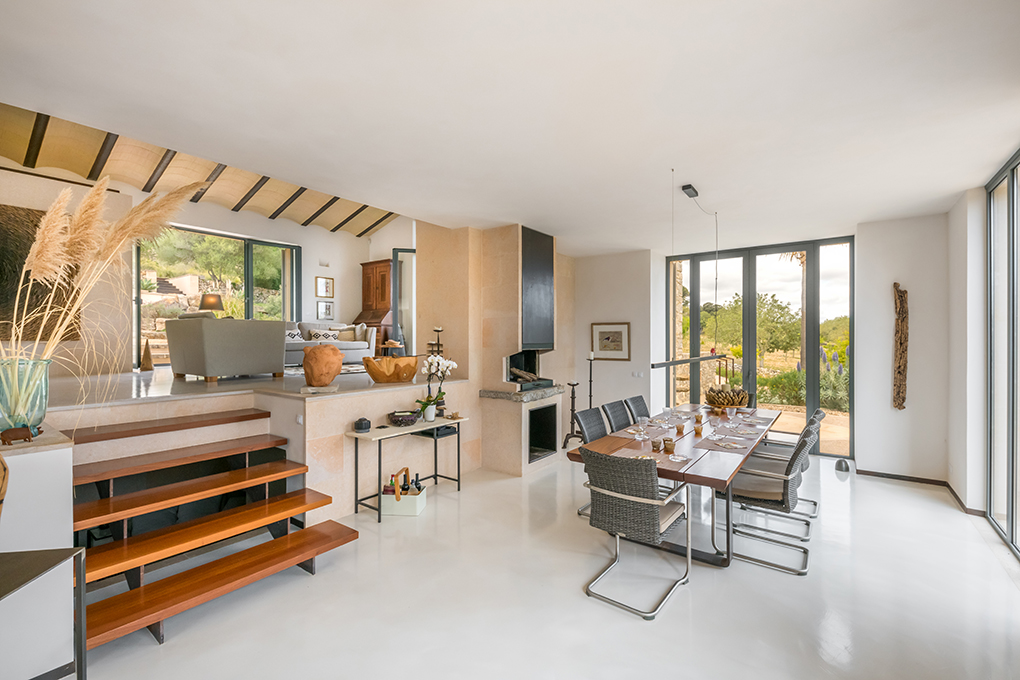 De begane grond van de finca heeft een grote eetkamer met een gezellige open haard en een modern ingerichte keuken met toegang tot buiten.