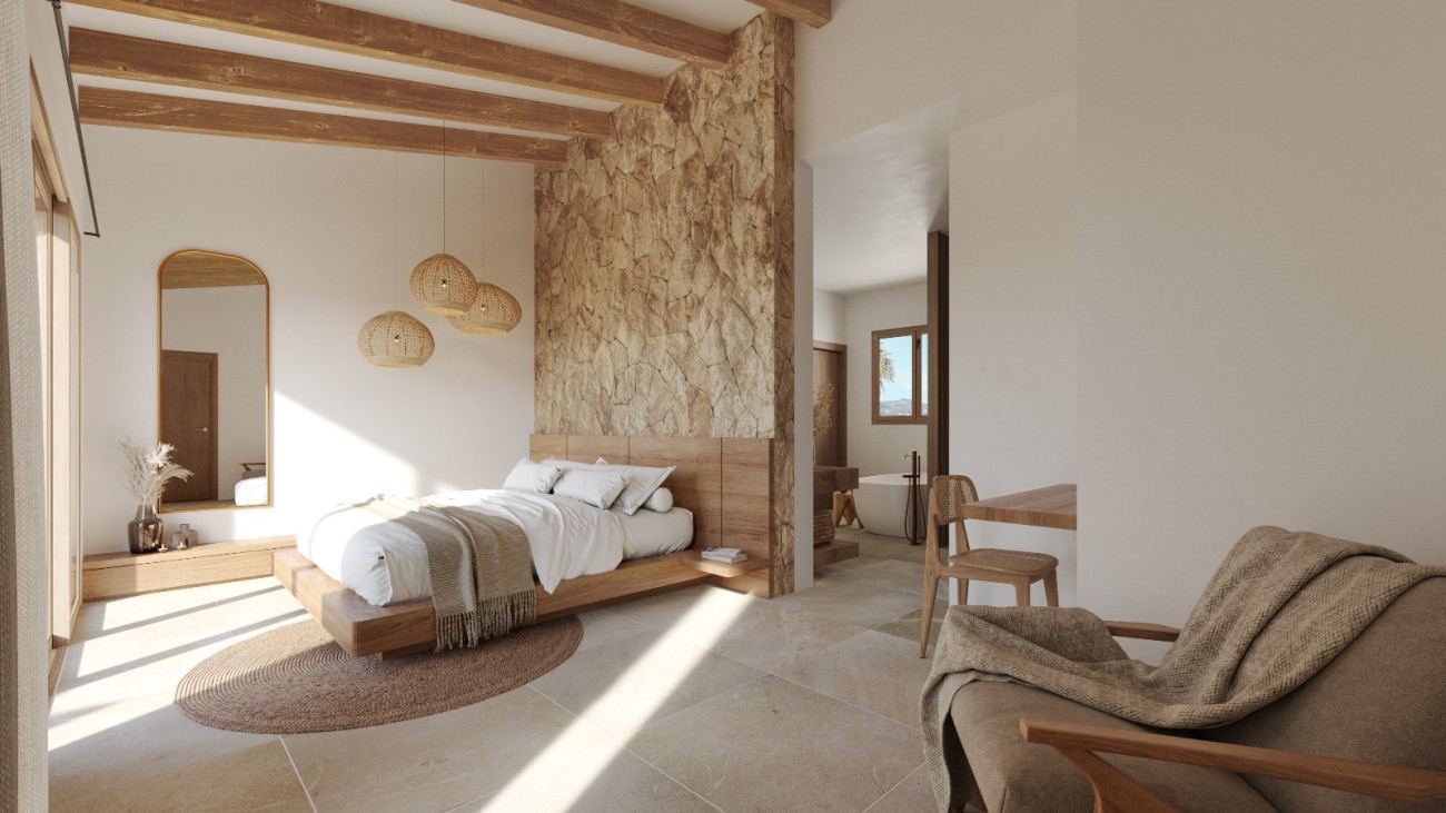 De constructie, die eind 2026 klaar zal zijn, is gemaakt met materialen van de hoogste kwaliteit en combineert een moderne mediterrane stijl. De stenen vloeren en houten balkenplafonds geven het interieur een authentiek en elegant tintje, terwijl de grote ramen natuurlijk licht toelaten in elke hoek van het huis.