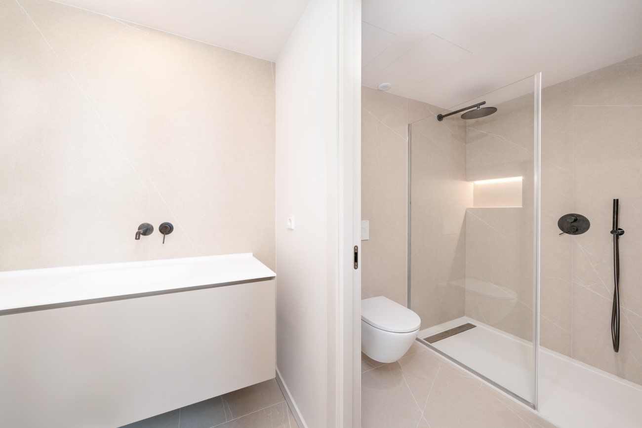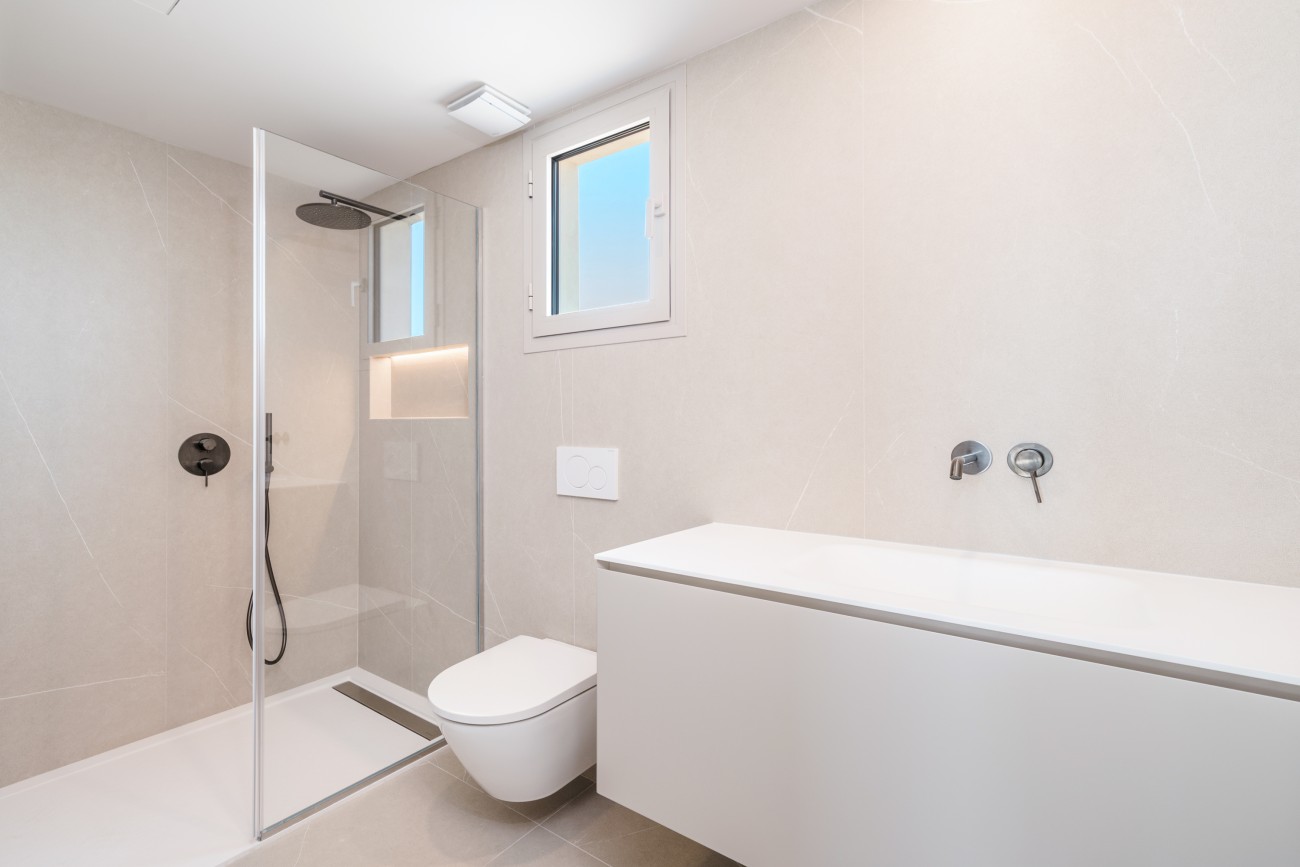 Het appartement is verdeeld over twee verdiepingen en heeft twee slaapkamers en twee badkamers, ontworpen met strakke lijnen en hoogwaardige afwerking. Overal liggen porcellanato vloeren, terwijl de open keuken is uitgerust met Bosch en Bora (of vergelijkbare) apparatuur voor zowel functionaliteit als stijl. Ramen met dubbele beglazing, vloerverwarming, airconditioning via een ventilatorconvector en warm water via een aerothermisch systeem zorgen het hele jaar door voor comfort. Het gebouw heeft ook een lift voor extra gemak.