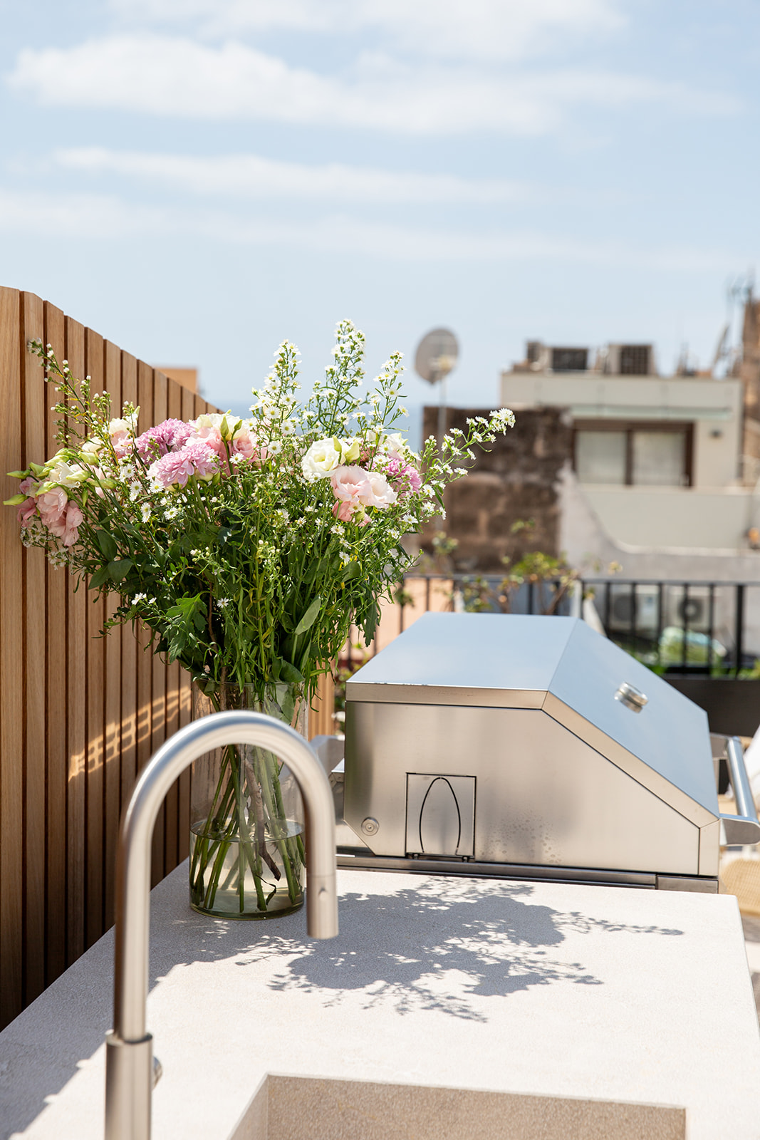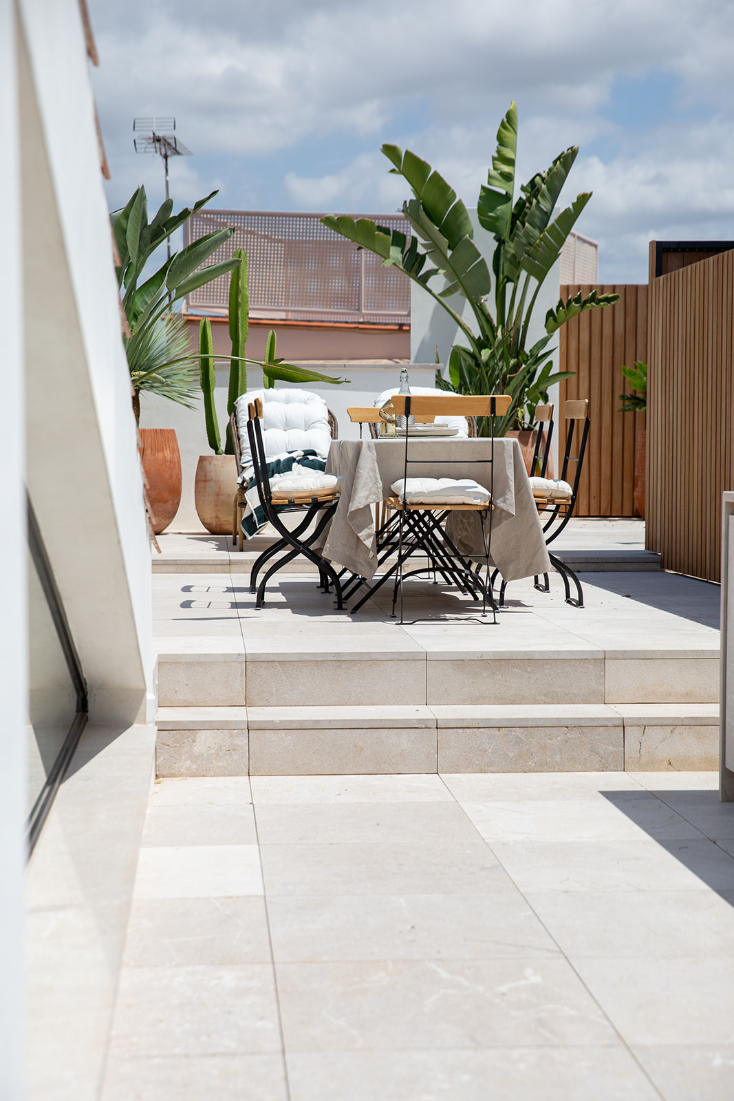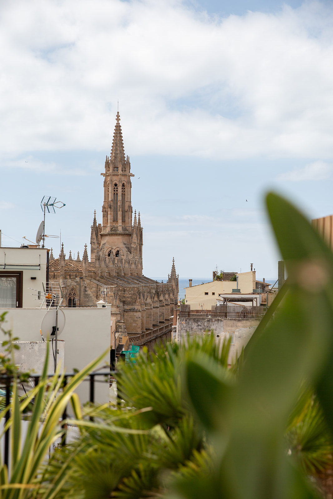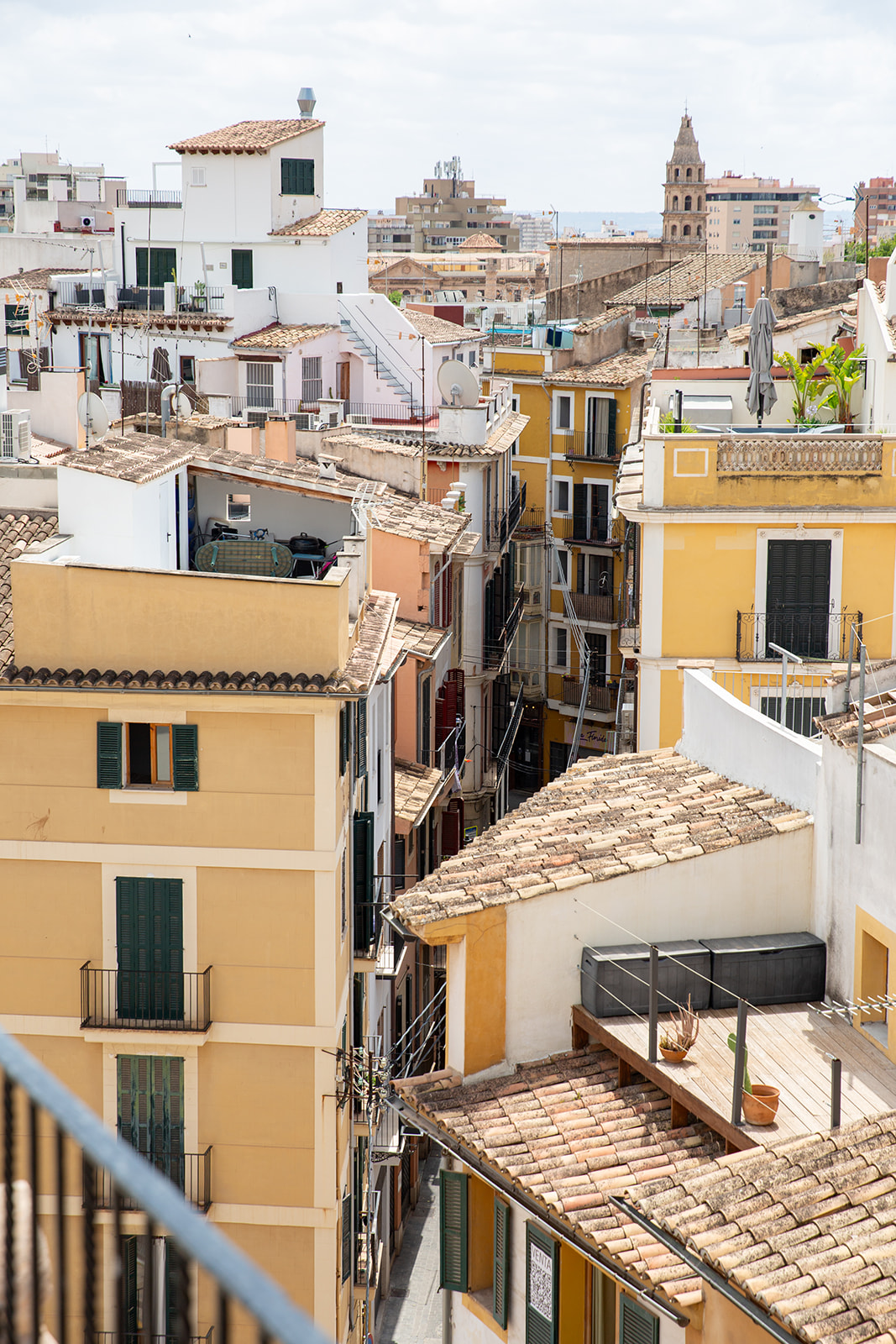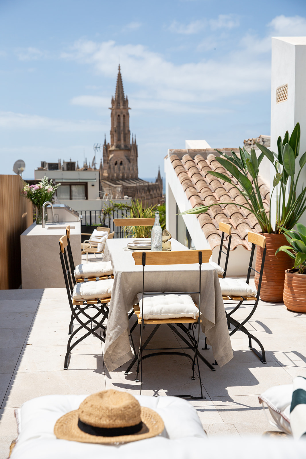 Vanaf hier leidt een trap naar een zonnig dakterras van 76 m² met panoramisch uitzicht op de kerk van Santa Eulalia, de kathedraal en het kasteel van Bellver. Verdeeld over verschillende niveaus is deze bevoorrechte buitenruimte perfect om te genieten van de winterzon of van warme zomeravonden hoog boven de levendige straten van de stad.