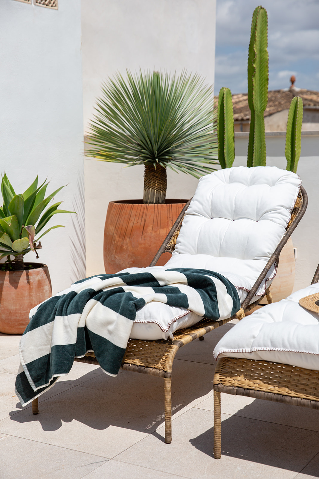 Aan de achterkant vind je twee royale slaapkamers, elk met een eigen badkamer. De eerste slaapkamer biedt uitzicht op de centrale binnenplaats, ingebouwde kasten en traditionele Mallorcaanse tegelvloeren, terwijl de tweede slaapkamer glazen paneeldeuren heeft die natuurlijk licht van de binnenplaats uitnodigen.
