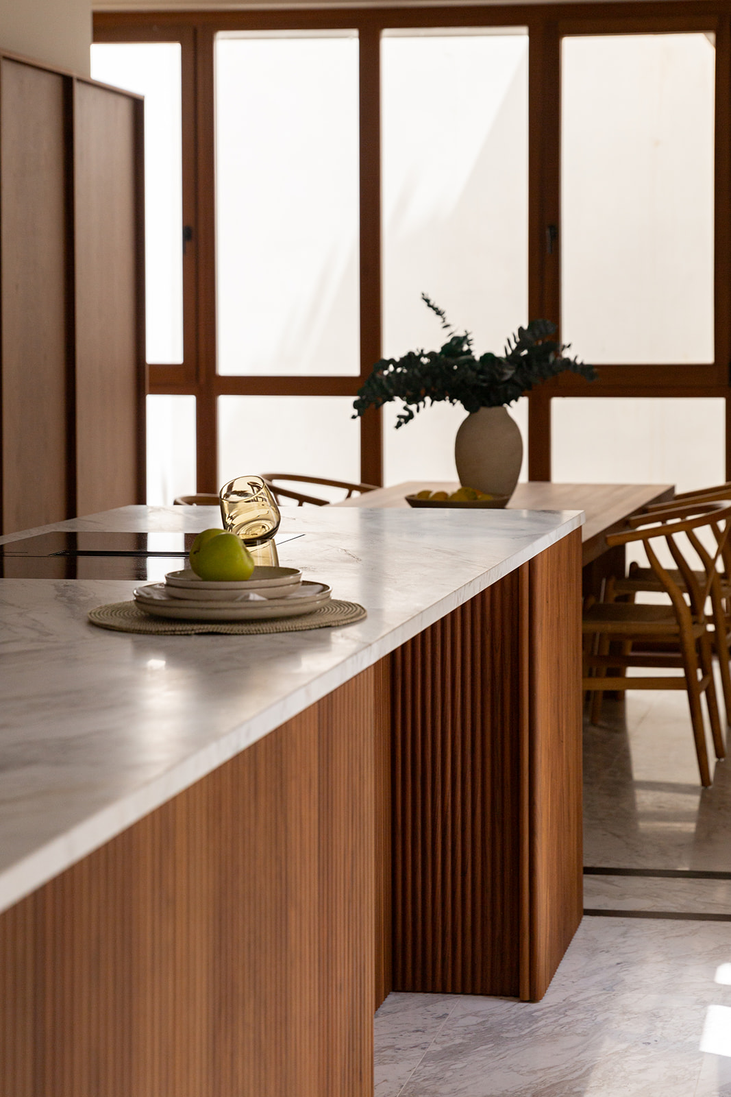 Overal liggen Volakas marmeren vloeren met houten afwerking en zichtbare balken, wat de ruimte een elegante, tijdloze charme geeft.