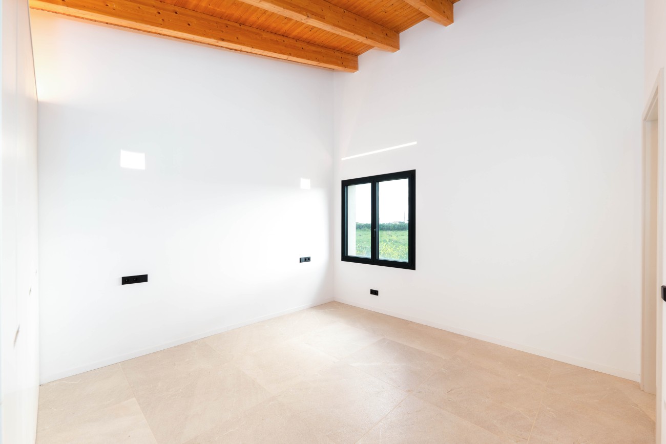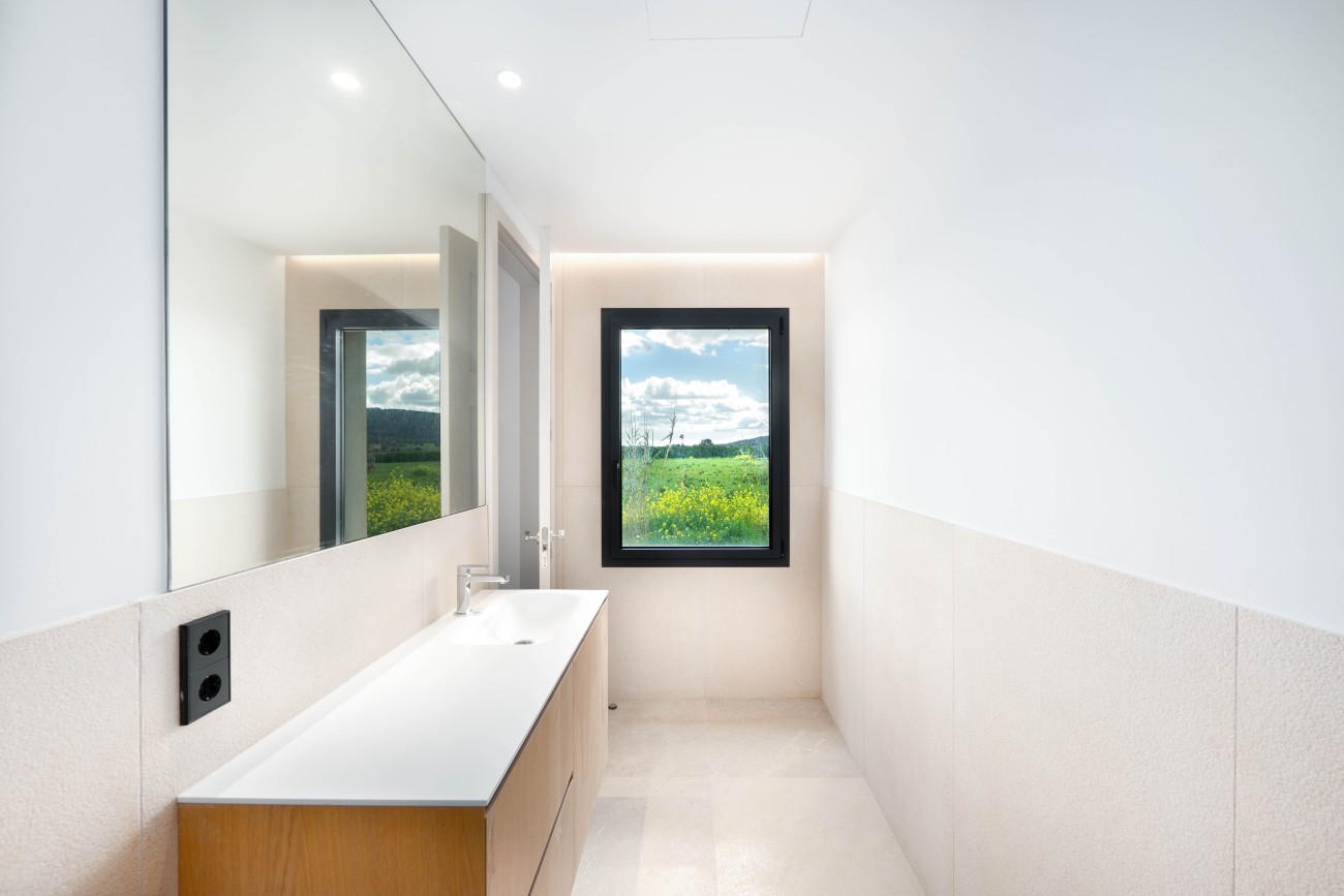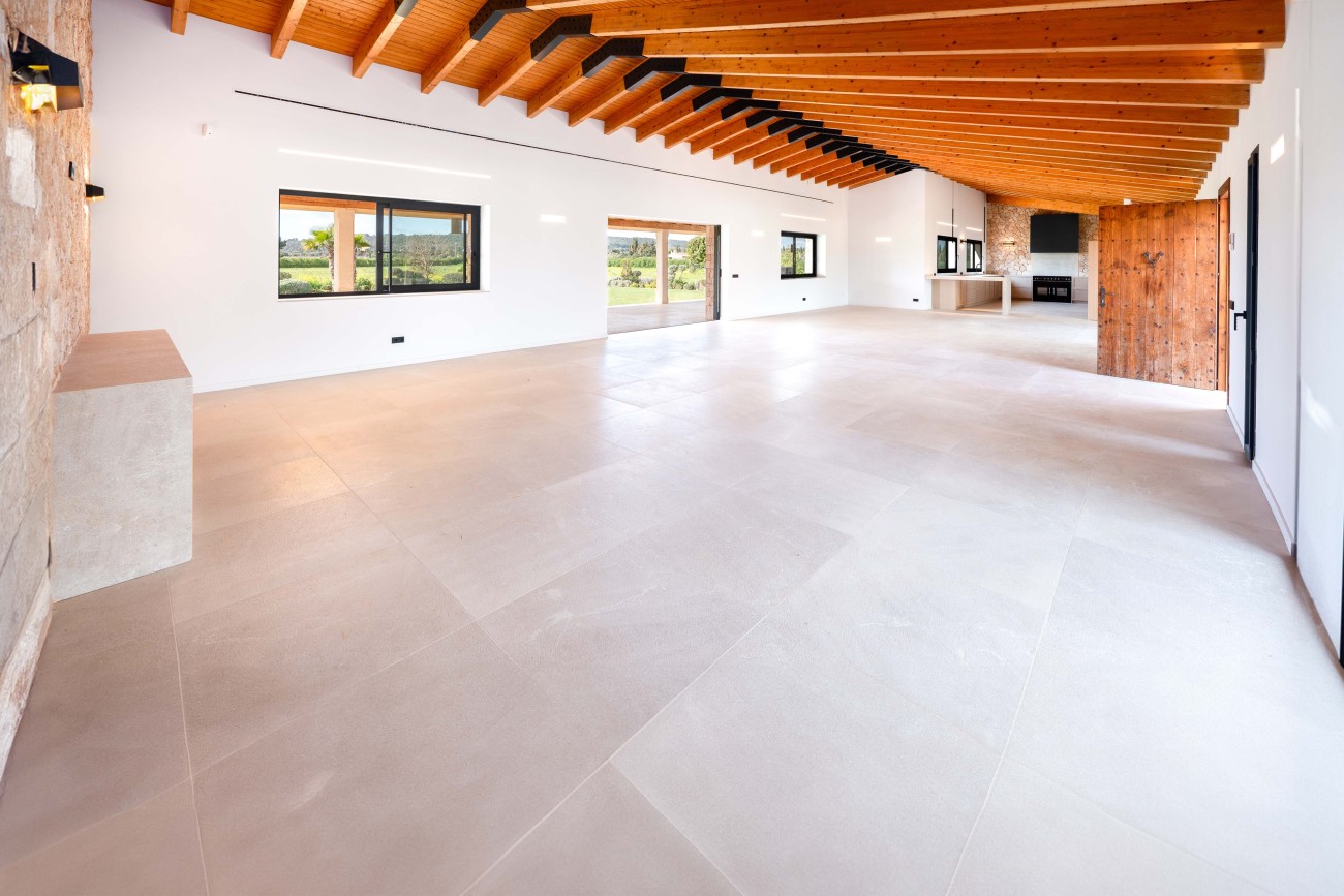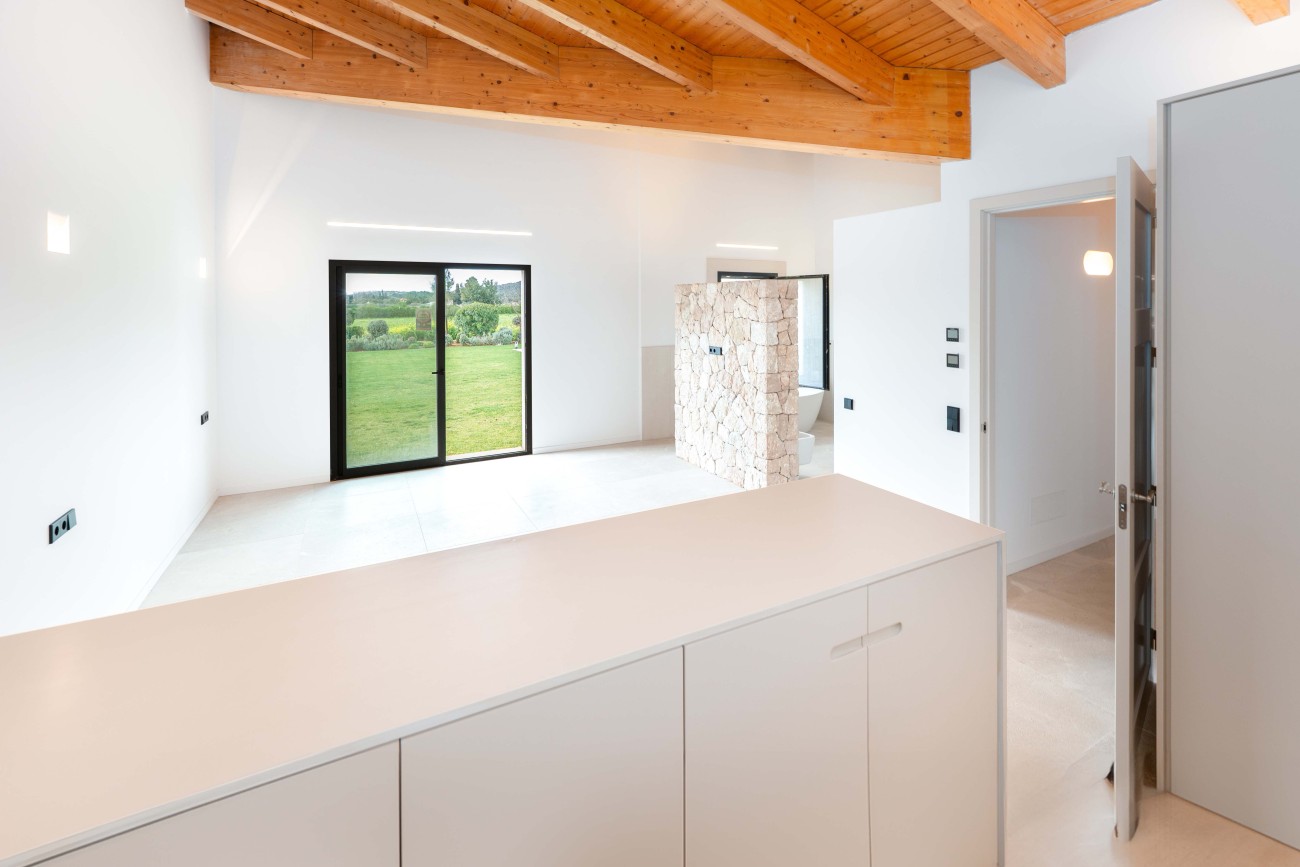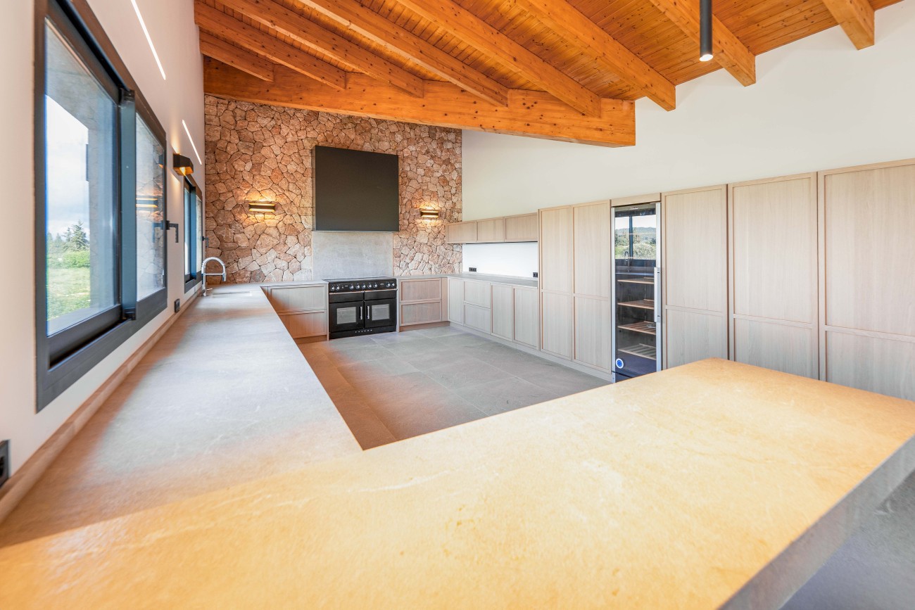 Deze nieuw gebouwde moderne finca ligt verscholen in het serene platteland van Santa Maria en biedt een uitzonderlijke mix van modern comfort en traditionele charme. Ontworpen in een U-vorm met hoge plafonds, beschikt het pand over grote open ruimtes die het natuurlijke licht maximaliseren en een prachtig uitzicht op de omliggende bergen en open velden. Door de ligging op het zuiden geniet het huis de hele dag door van overvloedig zonlicht, wat een warme en uitnodigende sfeer creëert.