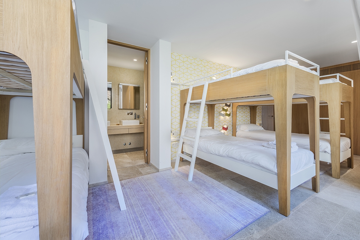 Op de middelste verdieping vind je vier extra tweepersoonsslaapkamers, elk met directe toegang tot een groot, gedeeld terras. Drie van deze slaapkamers hebben een eigen badkamer, terwijl de vierde wordt bediend door een aparte badkamer.