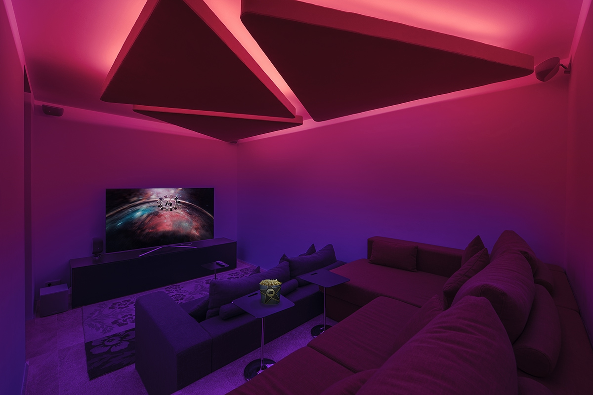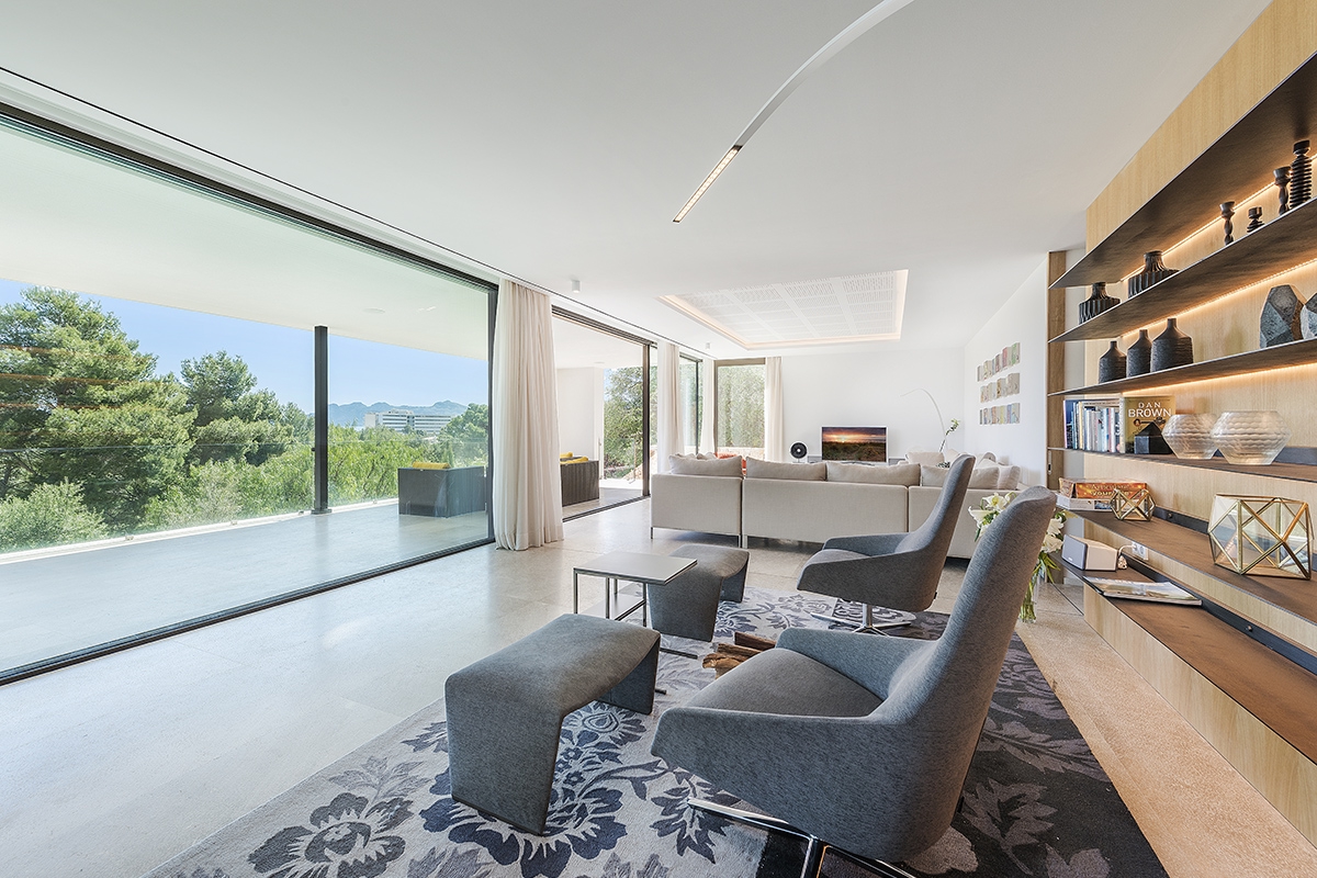 De begane grond is gewijd aan open wonen en entertainment, met een strakke Bultaup designkeuken, een grote lounge en eethoek, een bioscoopzaal en een groot overdekt terras dat de binnenruimte naar buiten toe uitbreidt.