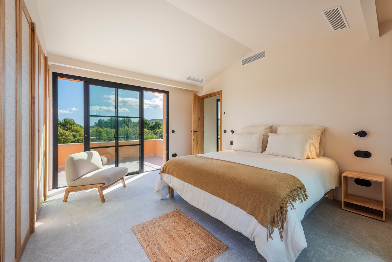 Op de bovenverdieping biedt de hoofdslaapkamer een sereen toevluchtsoord met een eigen badkamer en een balkon met prachtig uitzicht op het omliggende platteland.