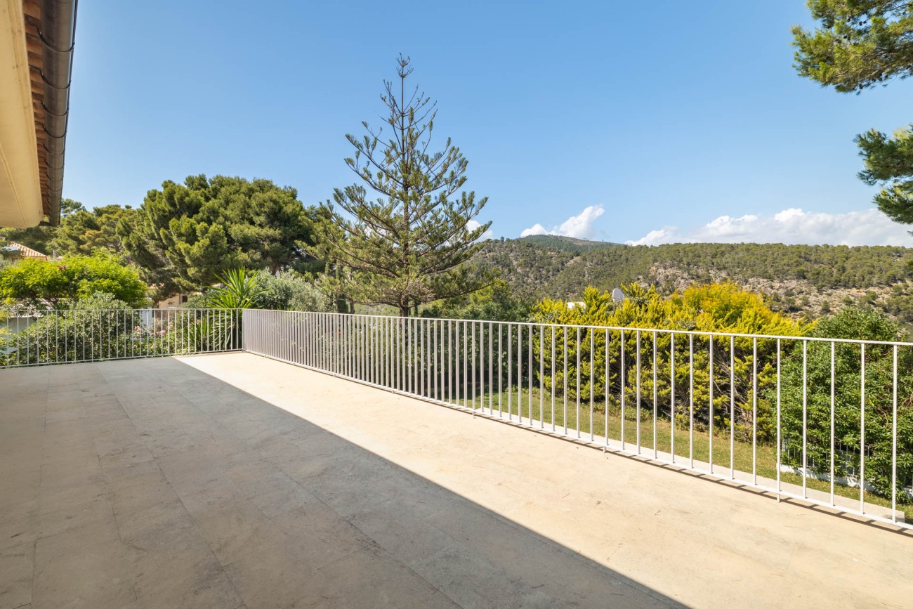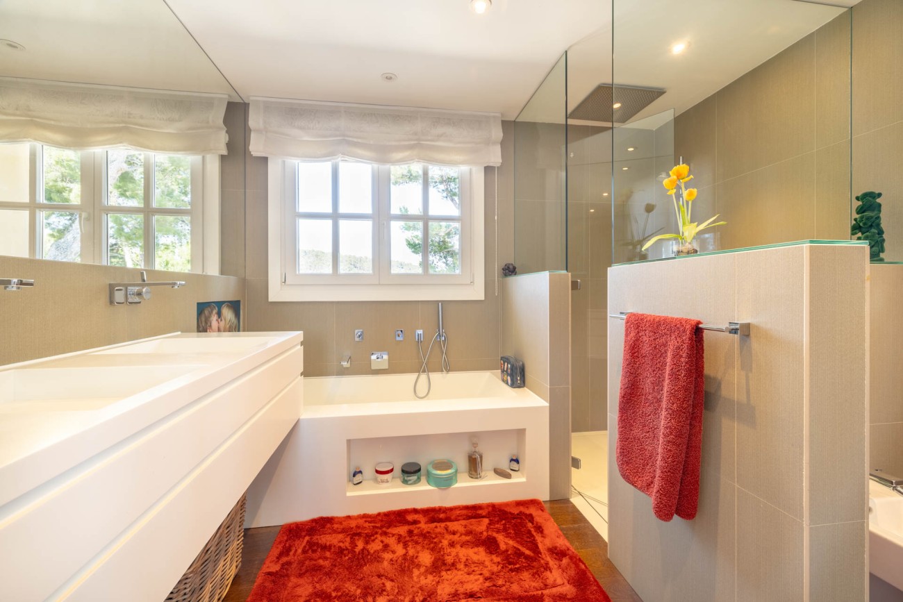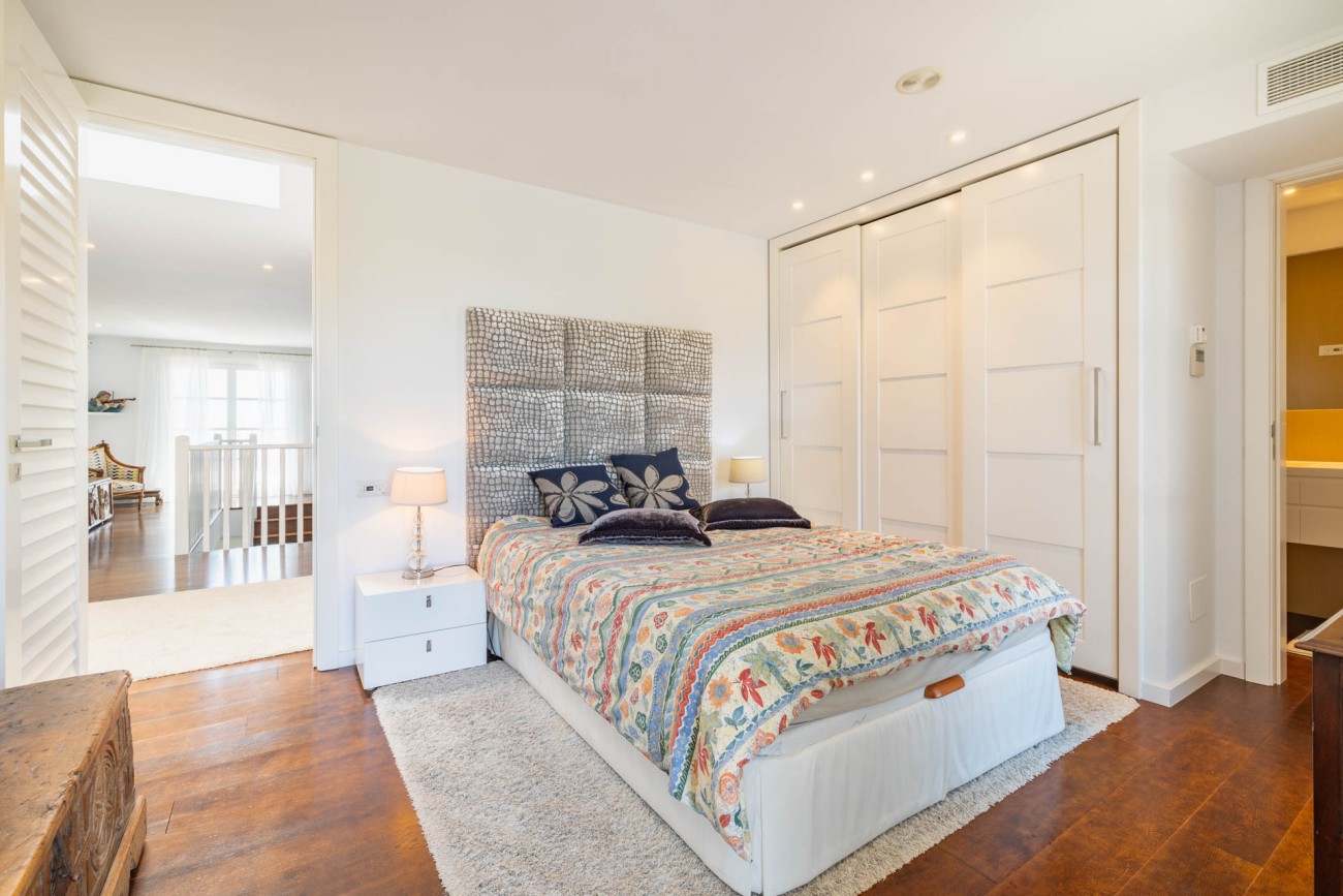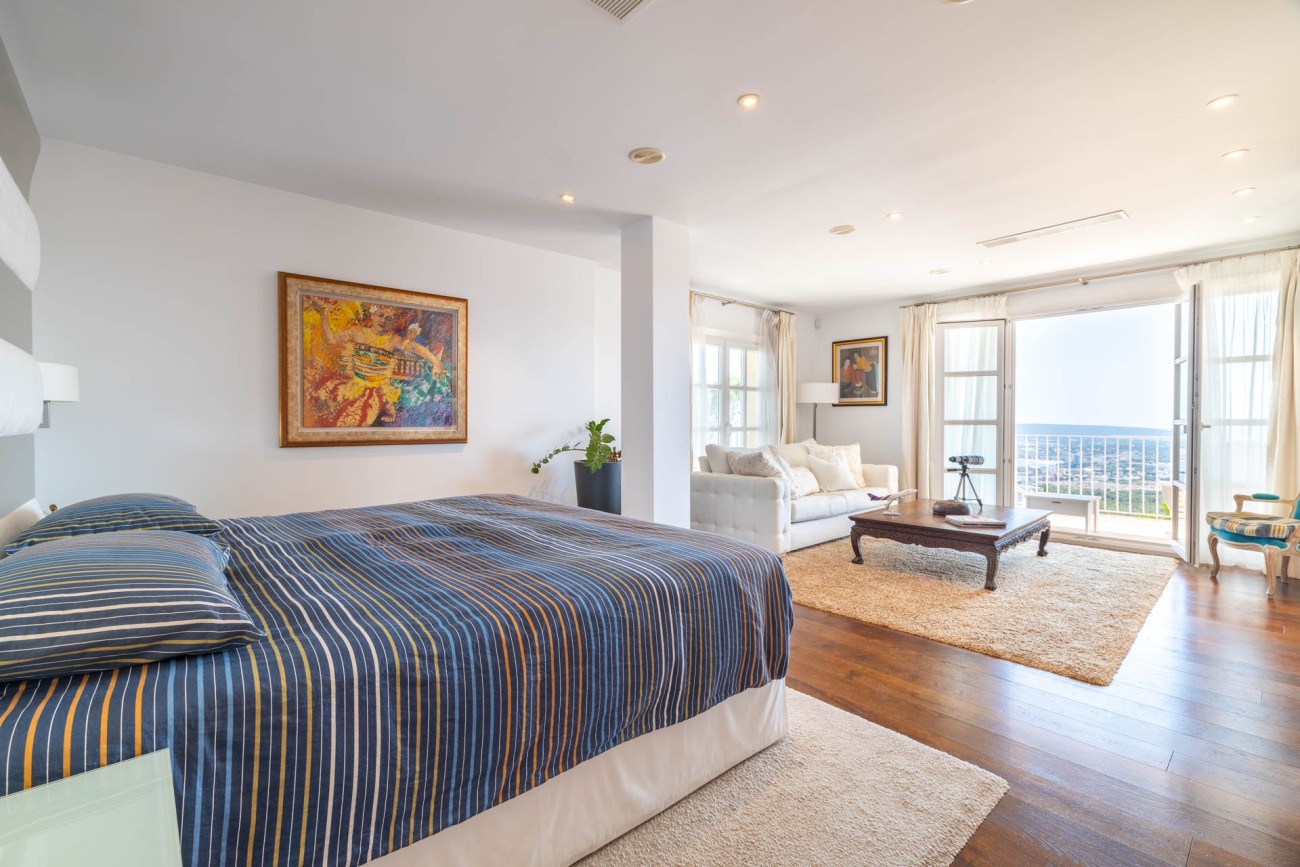 Als je naar de eerste verdieping gaat, ontdek je de grote slaapkamer, compleet met een chill-out ruimte, een eigen badkamer met een dubbele wastafel, bad en douche, evenals een ruime inloopkast. De hoofdslaapkamer biedt ook directe toegang tot een privéterras waar je kunt genieten van het prachtige uitzicht op zee. Verder zijn er nog twee tweepersoonsslaapkamers op deze verdieping, beide met eigen badkamer en inbouwkasten. Een van de ruime slaapkamers heeft een gezellige zithoek en biedt ononderbroken uitzicht op de baai van Palma. De andere slaapkamer geeft toegang tot een groot terras met uitzicht op het zwembad en biedt betoverend uitzicht op zee en de bergen.