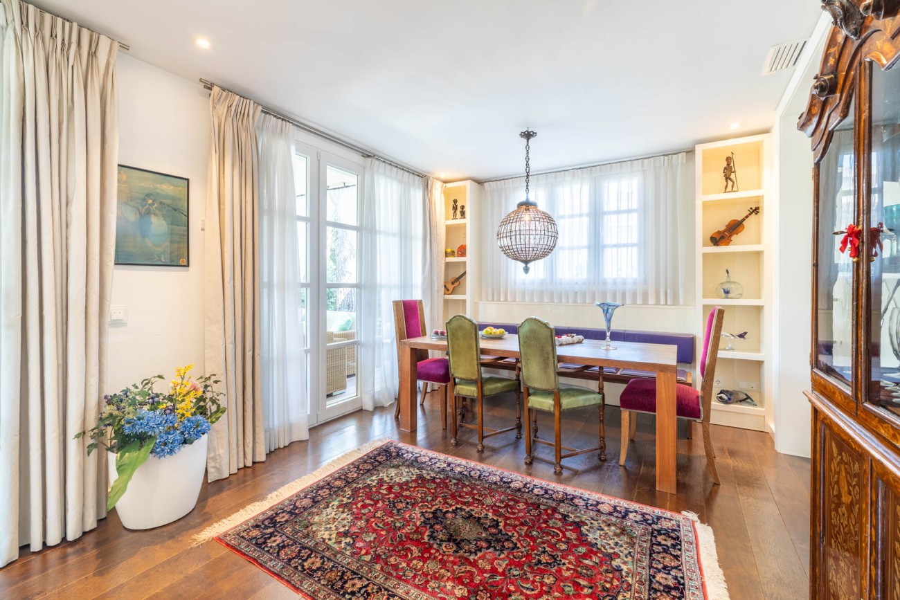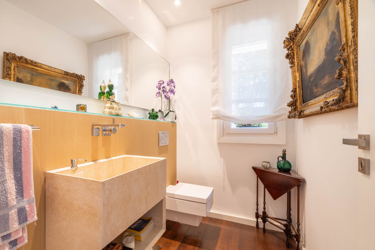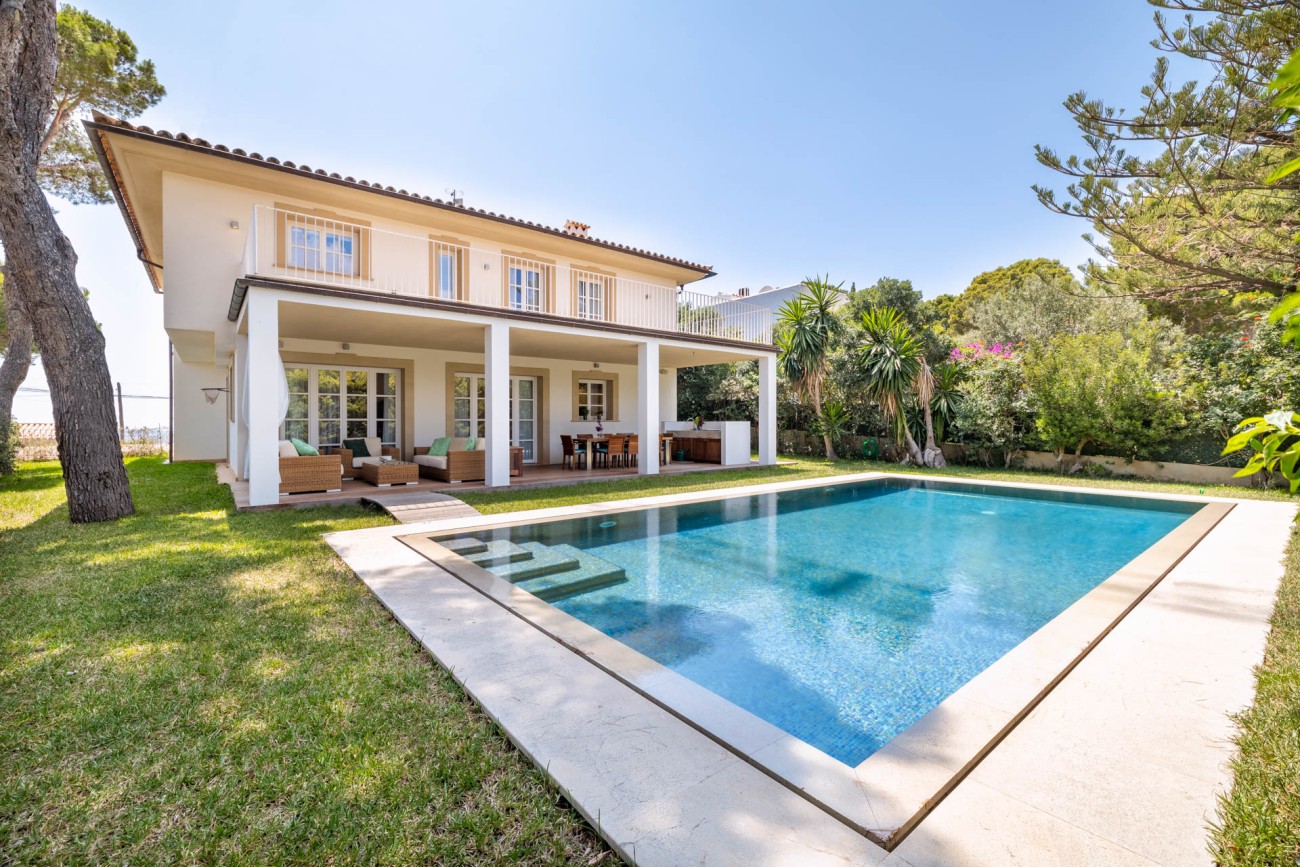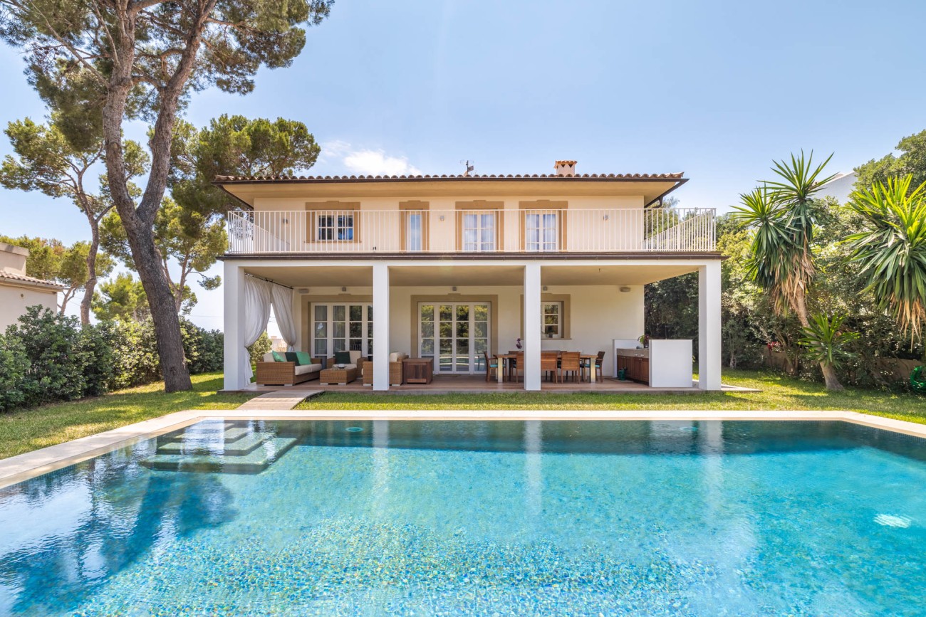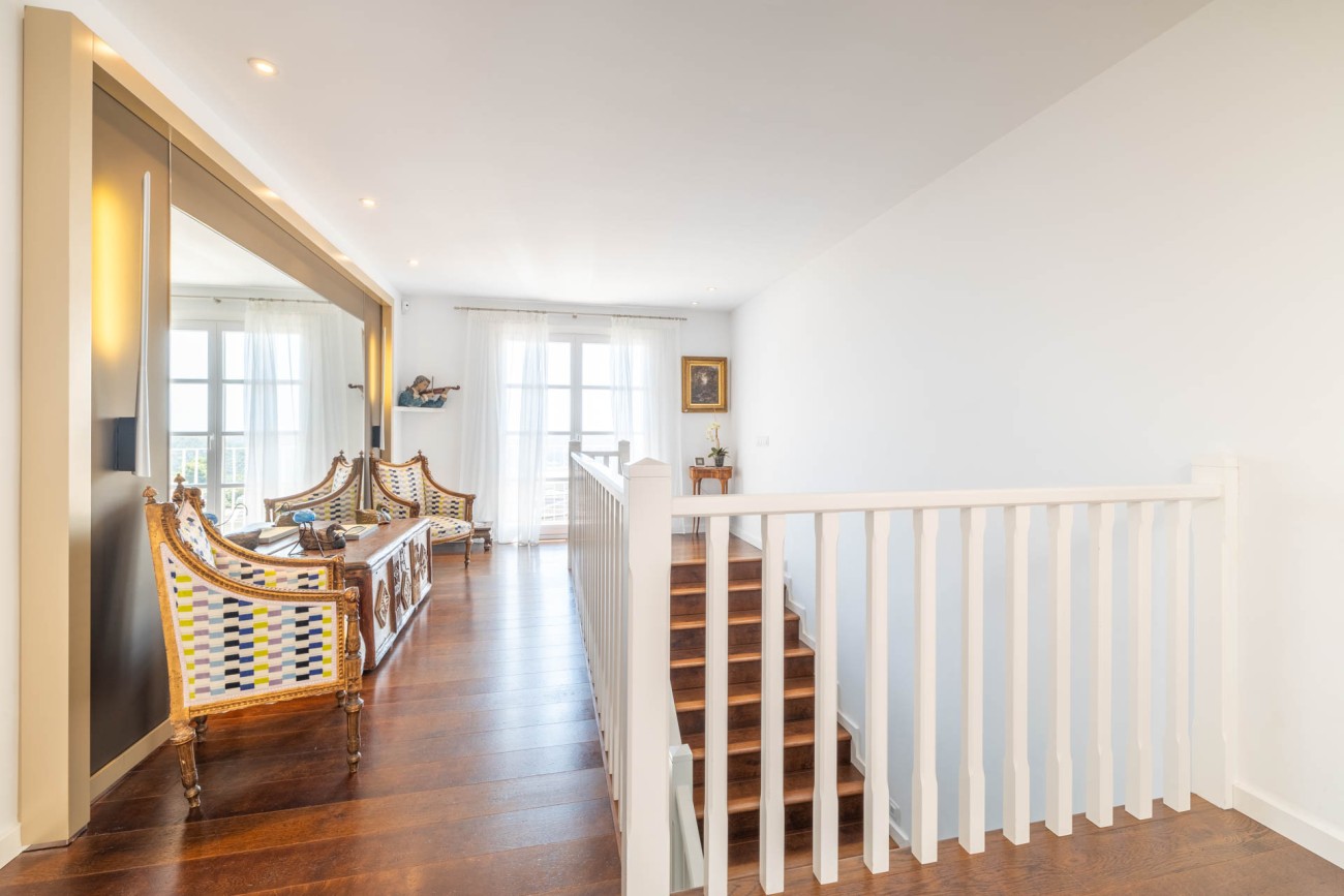 Als je naar de eerste verdieping gaat, ontdek je de grote slaapkamer, compleet met een chill-out ruimte, een eigen badkamer met een dubbele wastafel, bad en douche, evenals een ruime inloopkast. De hoofdslaapkamer biedt ook directe toegang tot een privéterras waar je kunt genieten van het prachtige uitzicht op zee. Verder zijn er nog twee tweepersoonsslaapkamers op deze verdieping, beide met eigen badkamer en inbouwkasten. Een van de ruime slaapkamers heeft een gezellige zithoek en biedt ononderbroken uitzicht op de baai van Palma. De andere slaapkamer geeft toegang tot een groot terras met uitzicht op het zwembad en biedt betoverend uitzicht op zee en de bergen.