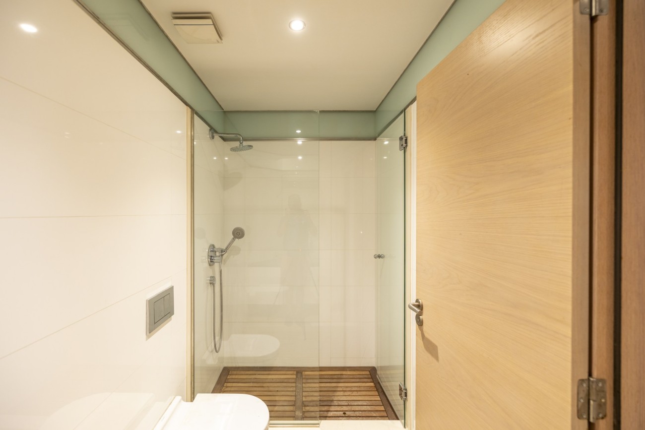 De woonkamer maakt indruk met hoge plafonds van 5 meter hoog, waardoor een gevoel van ruimte en grandeur ontstaat dat zelden wordt aangetroffen in de oude binnenstad. Het huis heeft twee slaapkamers, twee badkamers, een gastentoilet, een tv-kamer en een kantoor. De woning is voorzien van teakhouten schrijnwerk, dubbele beglazing, vloerverwarming, airconditioning, eiken parketvloeren en ingebouwde kasten.
