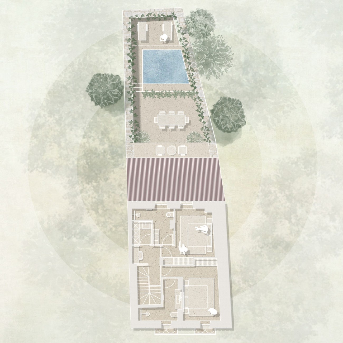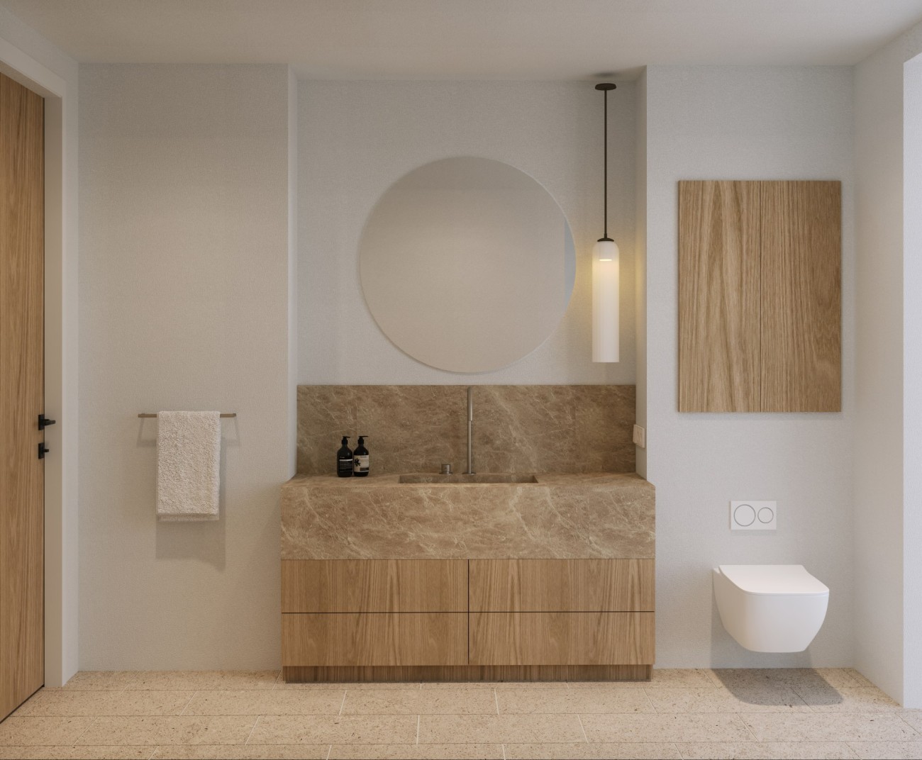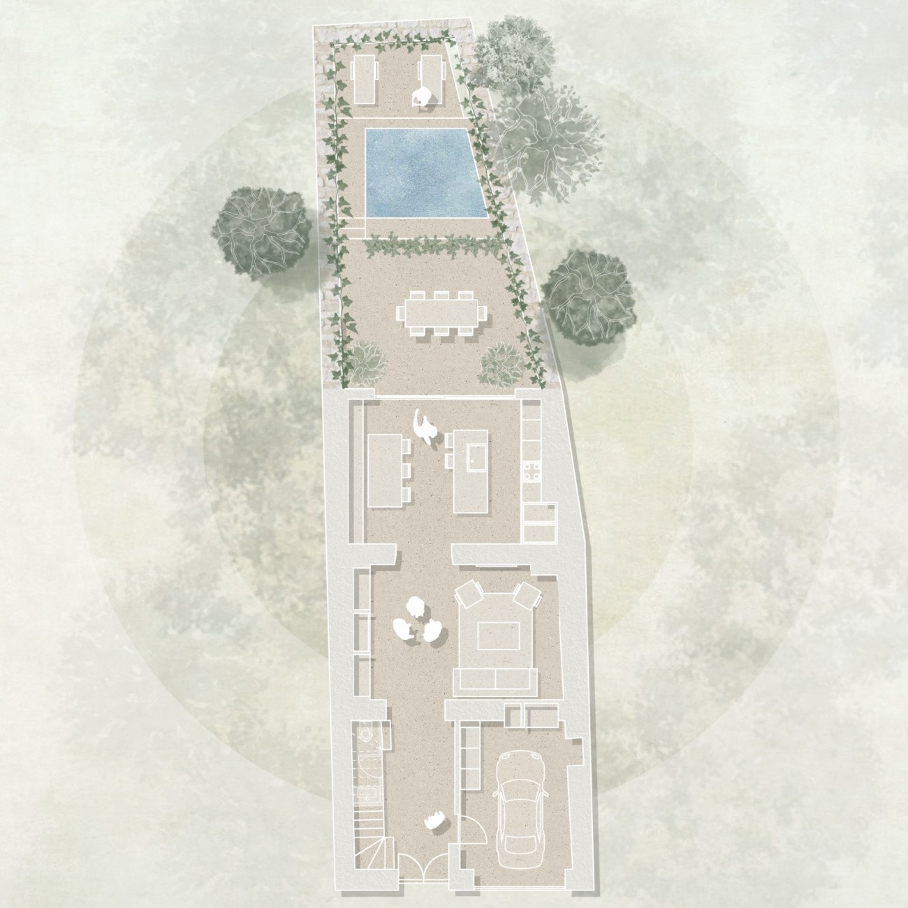 De begane grond bestaat uit een uitnodigende ontvangstruimte, een gastentoilet en een geïntegreerde garage met een elektrisch oplaadpunt. Een gezellige leefruimte met een open haard opent naar een stijlvolle moderne keuken, die naadloos overloopt in de aangelegde tuin, waardoor de ideale omgeving ontstaat voor een ontspannen mediterraan leven.