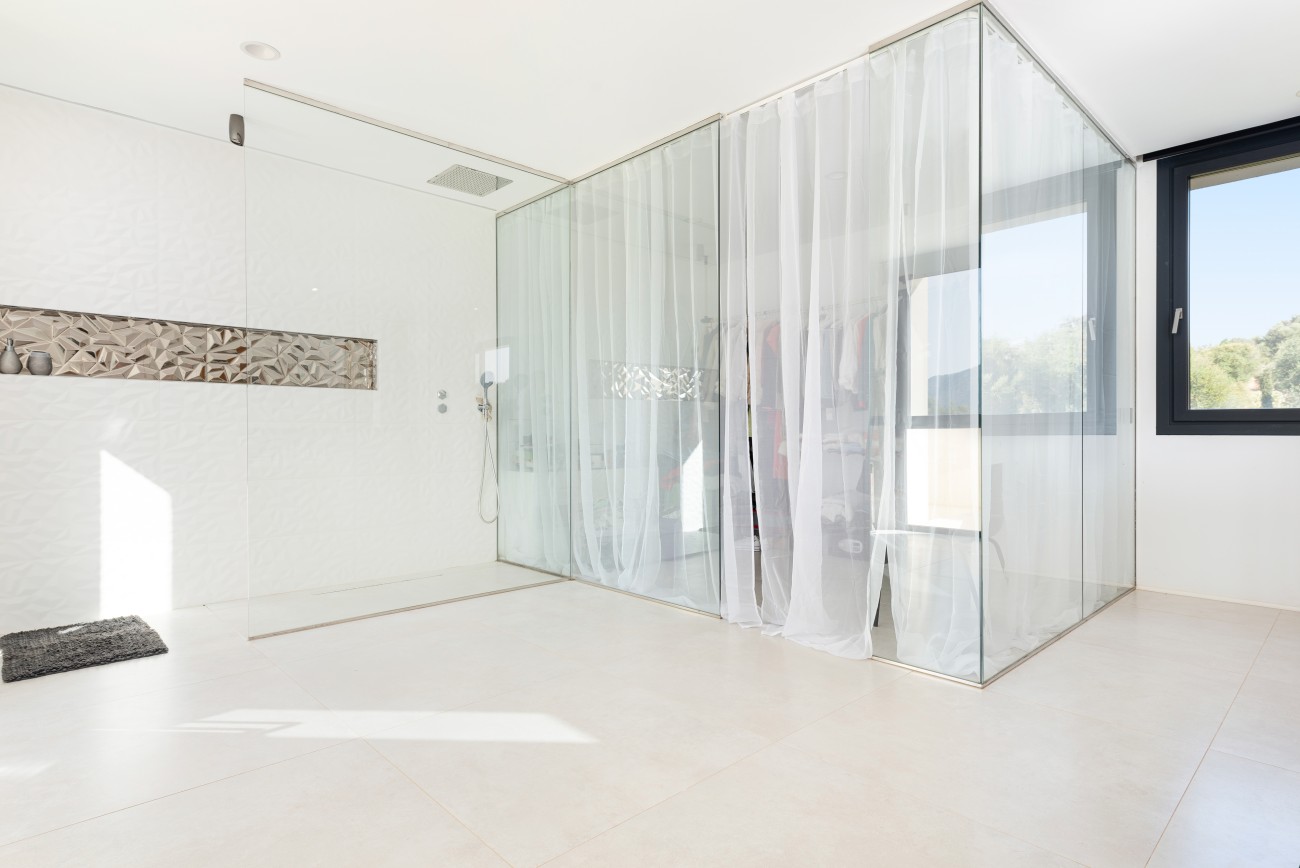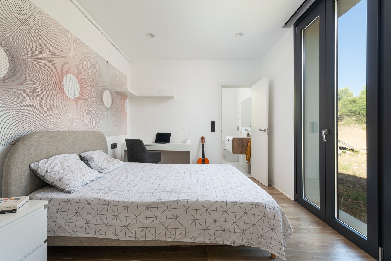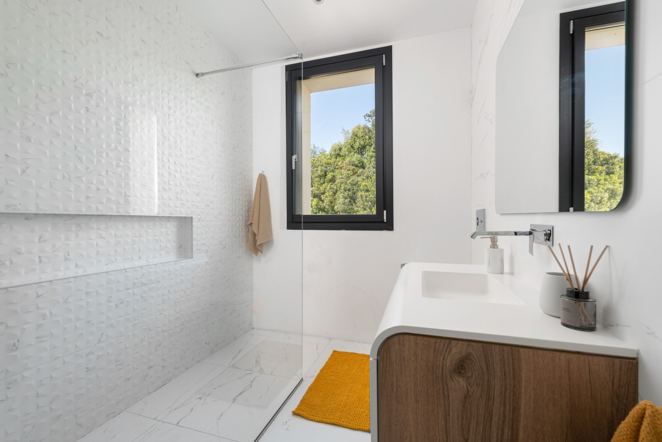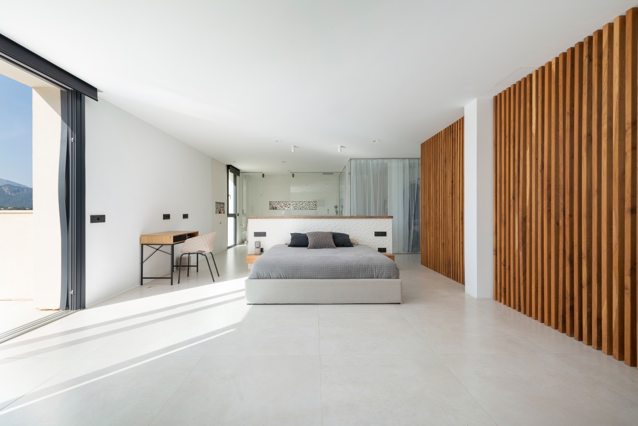 Met een bebouwde oppervlakte van ongeveer 500 m² biedt het huis vier ruime slaapkamers en drie badkamers. De master suite ligt op de eerste verdieping en heeft een luxe badkamer met zowel een douche als een groot bad, samen met een royale privékleedkamer.