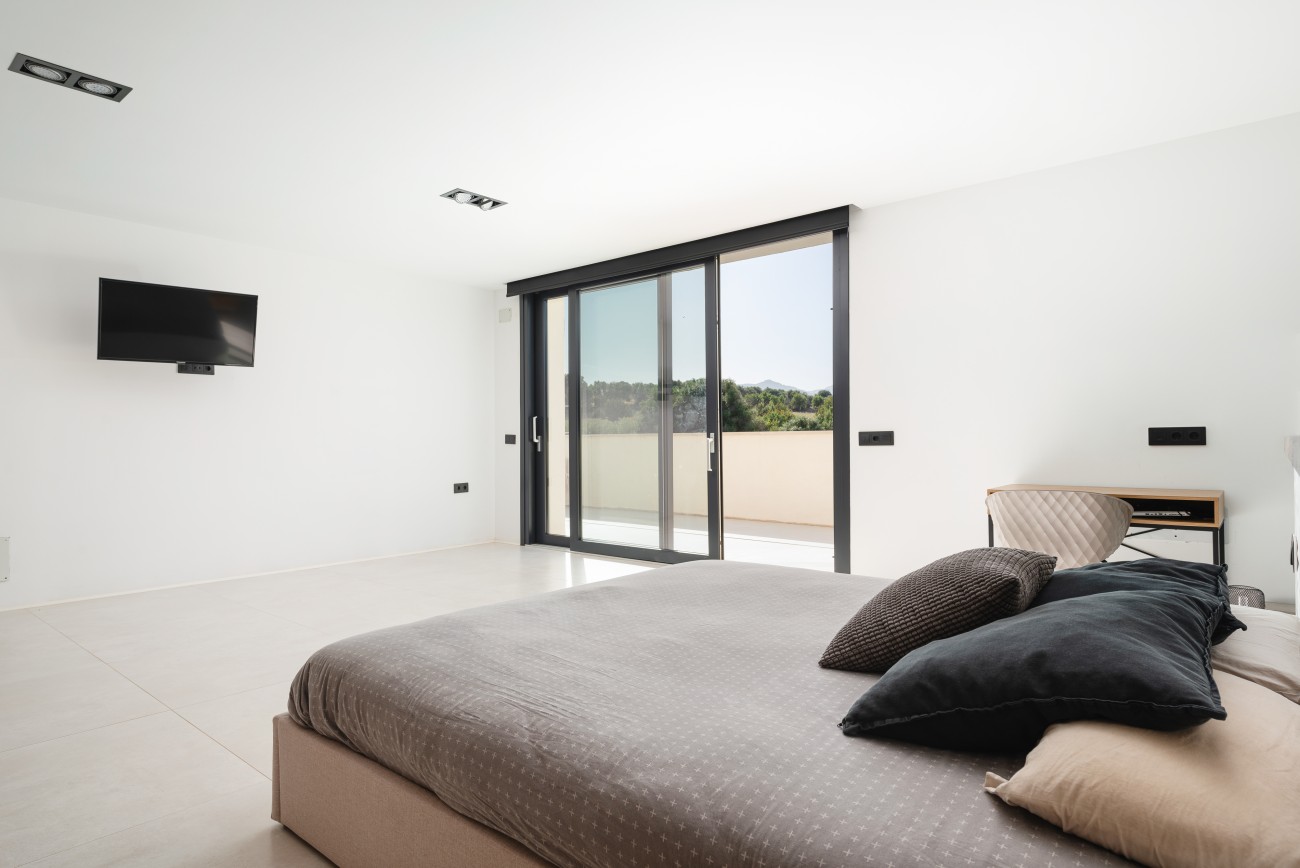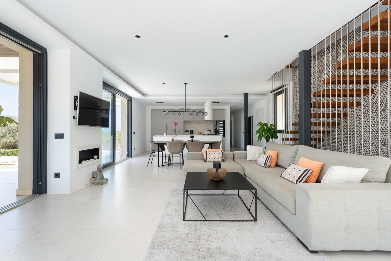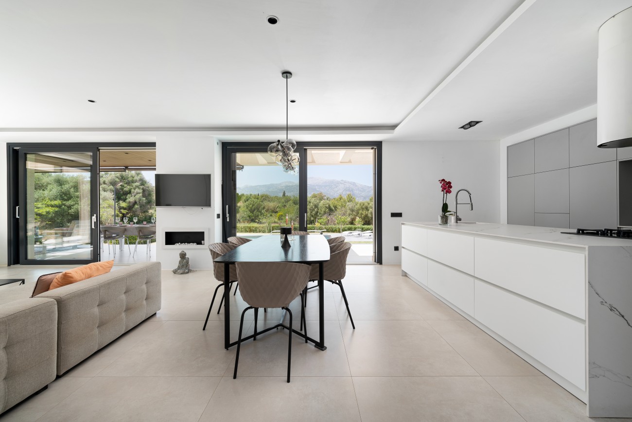 Het interieur is ontworpen met oog voor detail en is afgewerkt volgens de hoogste normen. De keuken, ontworpen door een gerenommeerd ontwerpbureau, is volledig uitgerust en heeft een centraal eiland. De open woon- en eetkamer heeft een gashaard, grote schuifdeuren en een overvloed aan daglicht, met directe toegang tot de buitenterrassen en het zwembad.