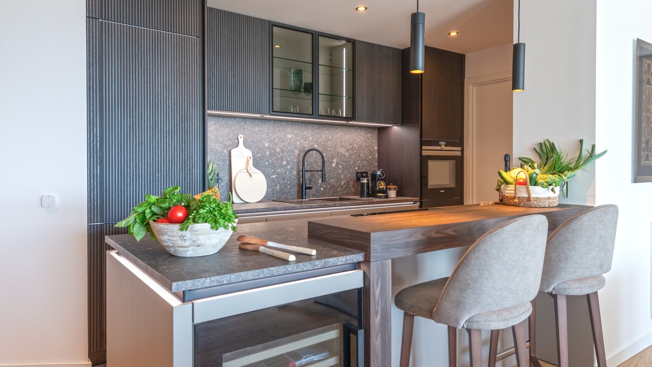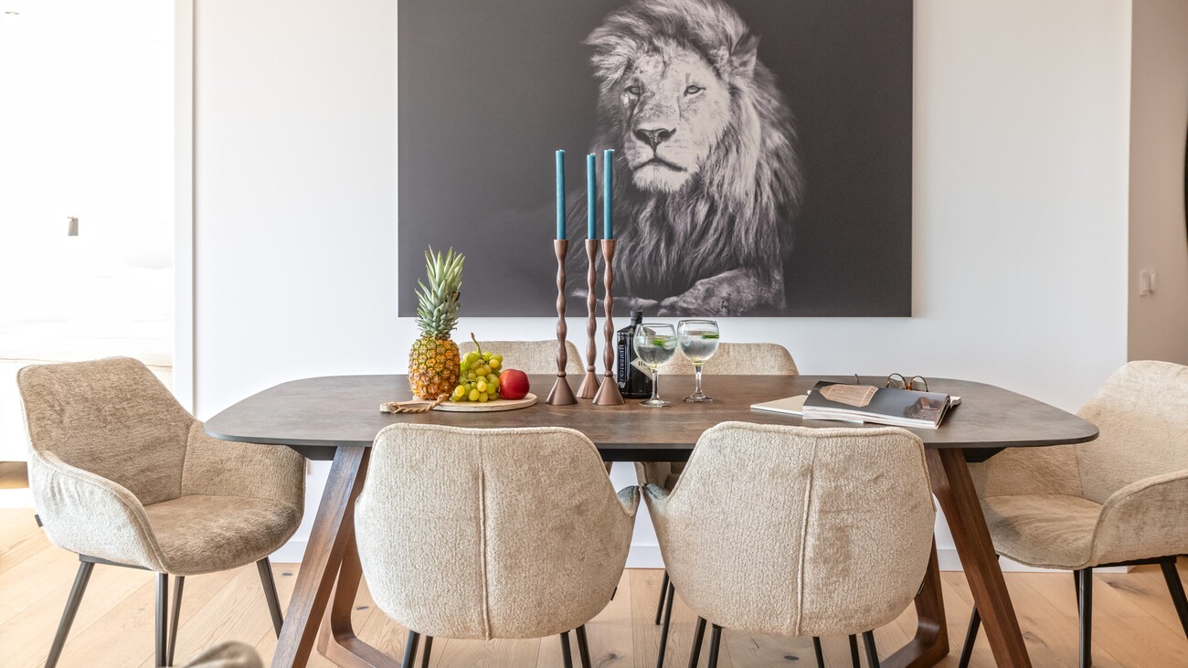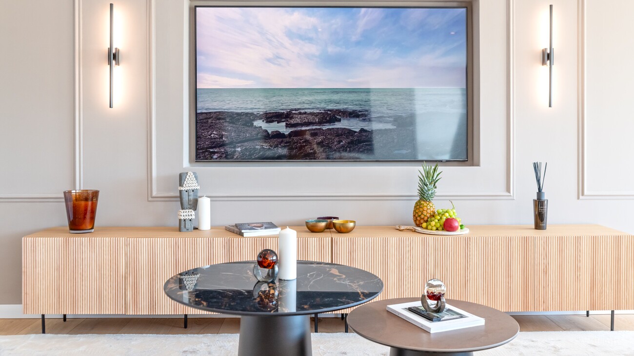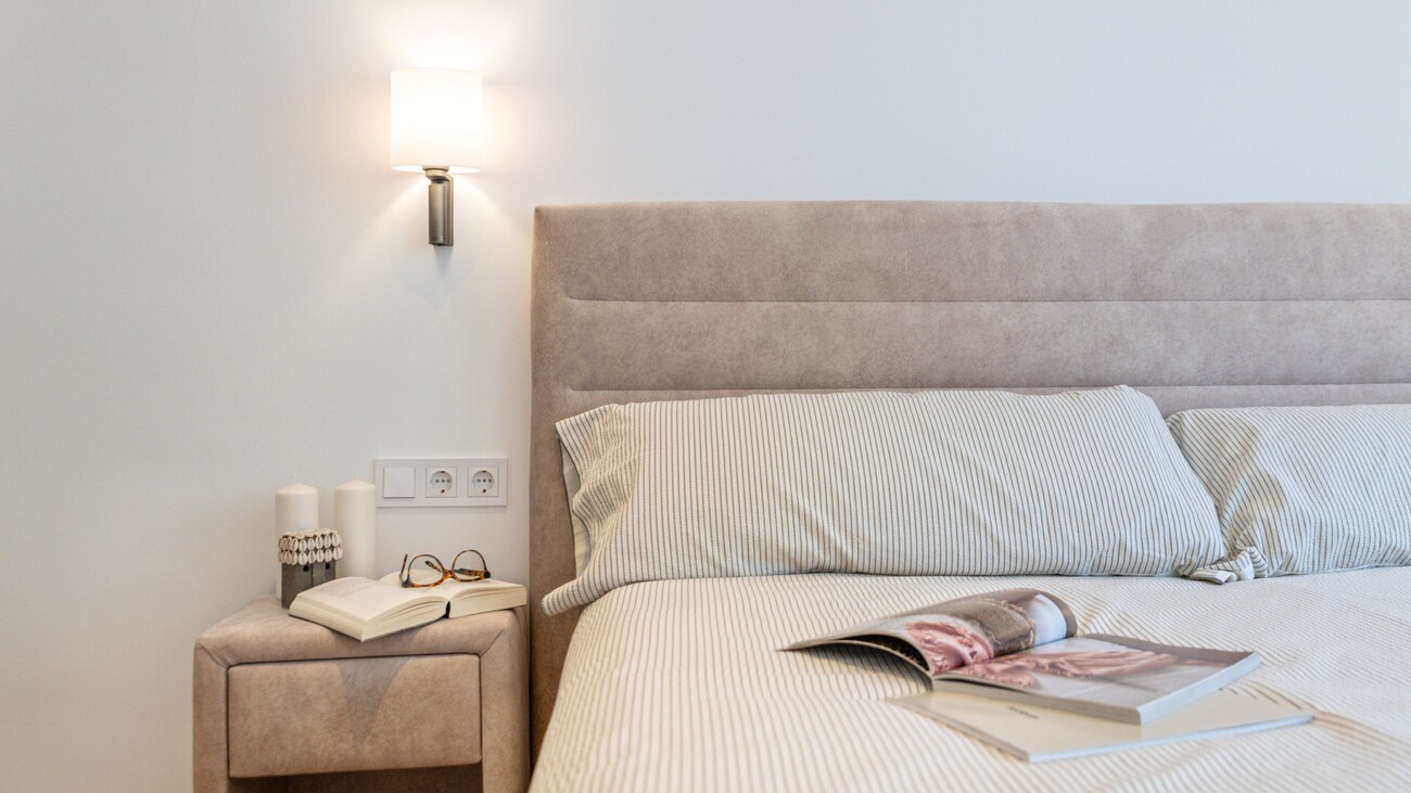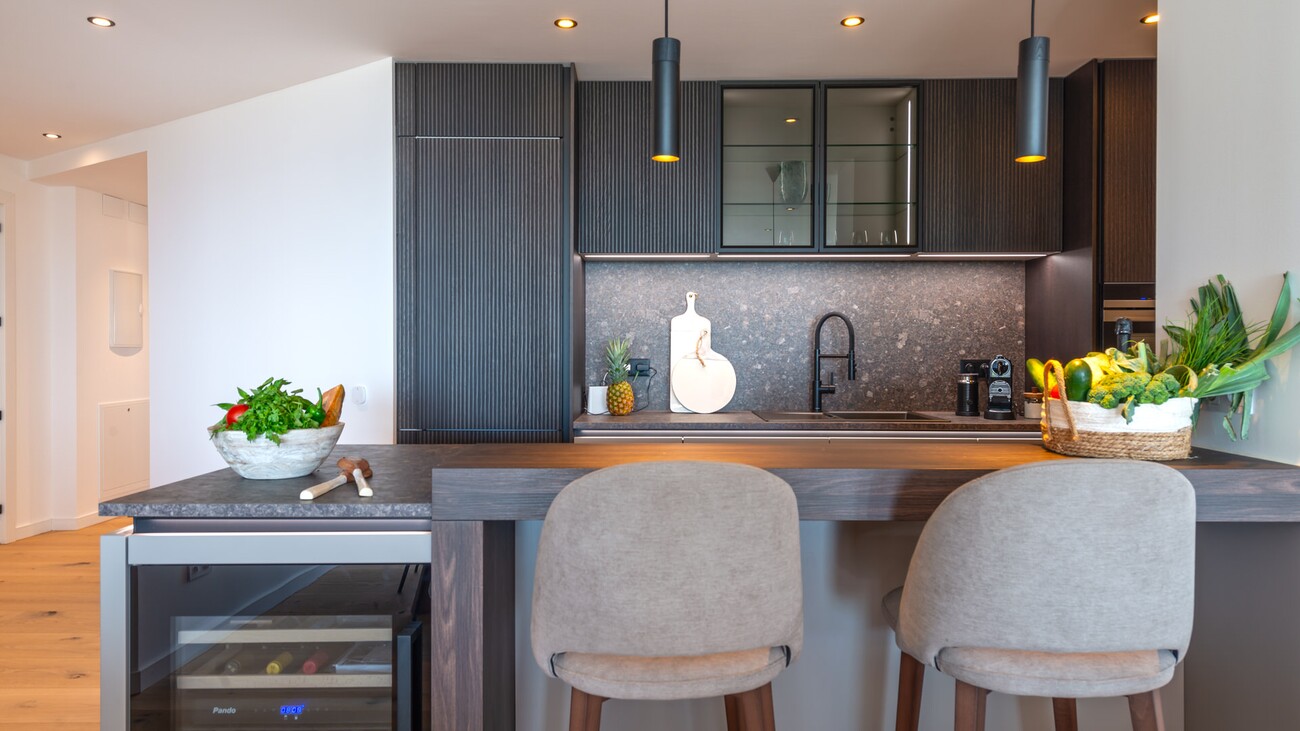 The interior is thoughtfully distributed, featuring three well-proportioned bedrooms and two bathrooms, designed to maximise comfort and practicality. High-quality, durable 12mm wooden flooring runs throughout, complemented by double-glazed aluminium windows, underfloor heating, and air conditioning. The modern kitchen is fully equipped with premium appliances from Bora and Siemens, along with Nolte cabinetry, and connects seamlessly to the living space. Additional features include a 21 m² terrace with sea views, a pantry, electric shutters, a Wi-Fi connected sound system, and the property is sold fully furnished with selected Italian brands.