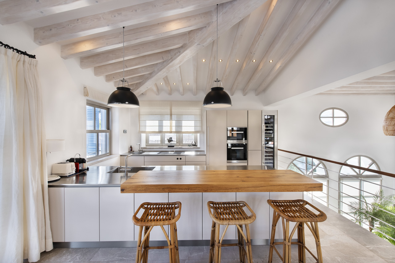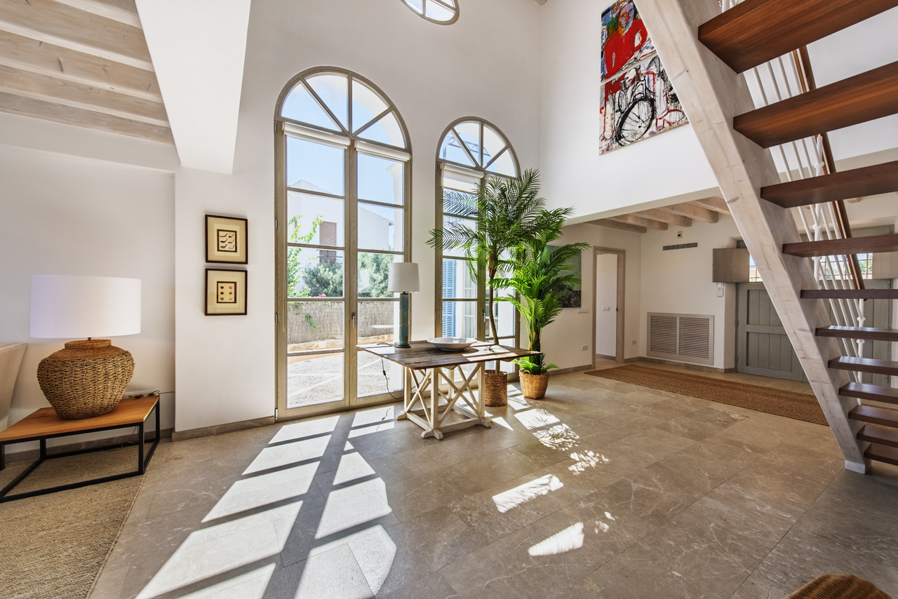 Elk detail weerspiegelt kwaliteit en vakmanschap: gecentraliseerde warme en koude airconditioning gecombineerd met vloerverwarming aangedreven door aerothermische energie, exterieur houten schrijnwerk met Climalit beglazing, en interieur essen timmerwerk afgewerkt in helder wit. De vloeren zijn afwisselend van natuurlijke Mallorcaanse steen met bush-hammered en gezoete afwerkingen, eiken parket in de woonkamer en warme houtaccenten in de slaapkamers op de bovenverdieping. De aangelegde tuin, compleet met automatische irrigatie, voegt de laatste serene noot toe aan deze uitzonderlijke woning.