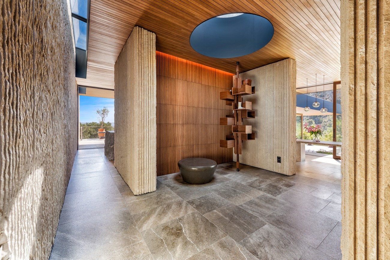Binnen is er een unieke hal met een futuristisch rond dakraam die leidt naar een moderne keuken met een eiland en een ontbijtbar, daarnaast is er een aparte eethoek en een split-level woonkamer met een eigentijdse hangende open haard.