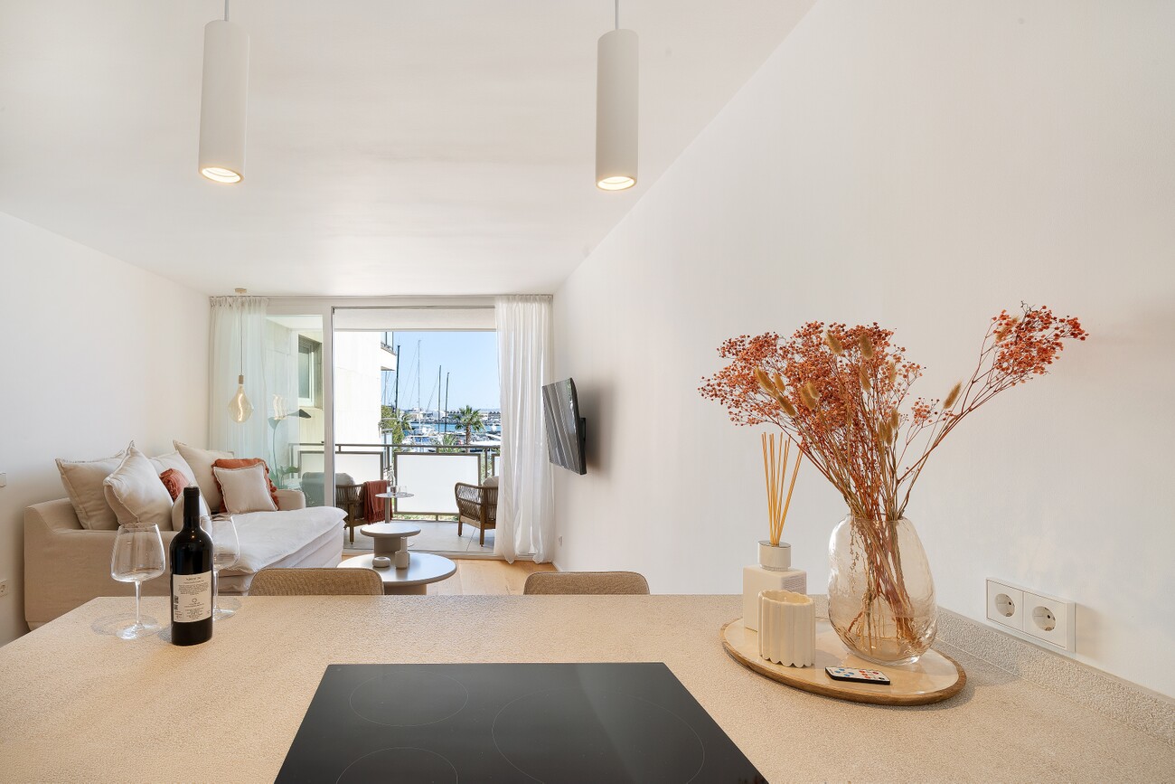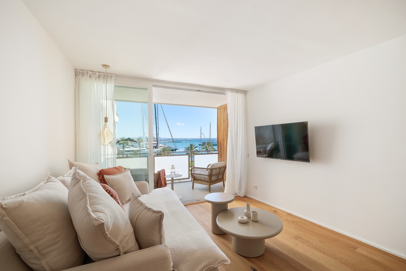 This refined first-floor apartment for sale in Palma enjoys an exceptional setting, positioned directly in front of the harbour and overlooking the sea and its elegant yachts.
