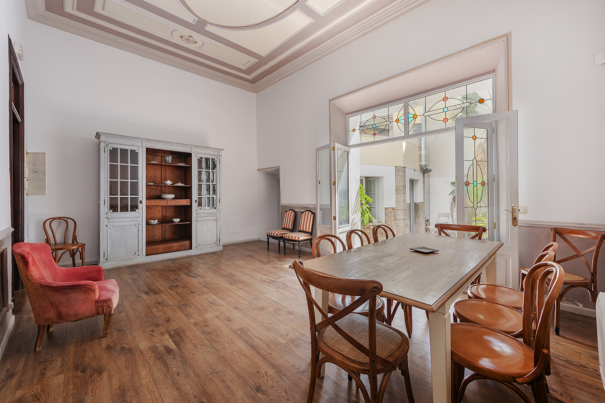 Op dit moment is de begane grond verdeeld in twee delen; de ene kant heeft een zitgedeelte met hoge decoratieve plafonds en een heerlijk terras op de binnenplaats om te dineren. De andere kant is toegankelijk via een mooie entreehal, traditionele stenen vloeren, een wenteltrap en een opslagruimte.