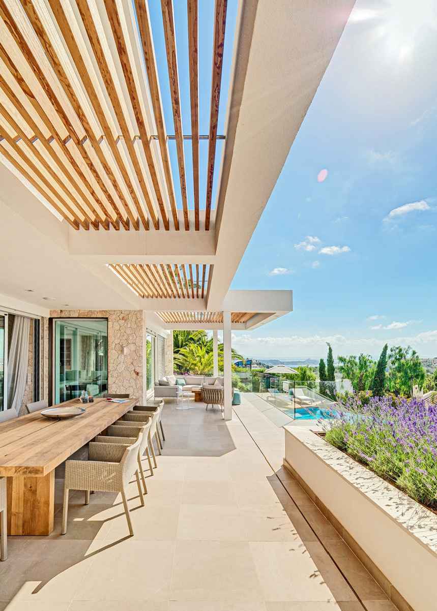 En el exterior, una piscina privada de agua salada de 12×5 m y un jardín paisajístico ofrecen un refugio relajante, mientras que una terraza en la azotea brinda vistas panorámicas del campo.