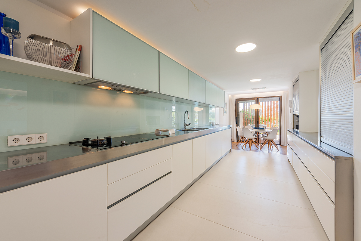 At present, the apartment is part of a duplex and comprises a large living room with a semi-open kitchen, both of which open onto the covered terrace overlooking the sea . On one side of the apartment is the dining area and on the other is the summer lounge with a large chill-out area. Furthermore, there is a games and TV room at the back, as well as a bedroom, a bathroom, and the laundry room.