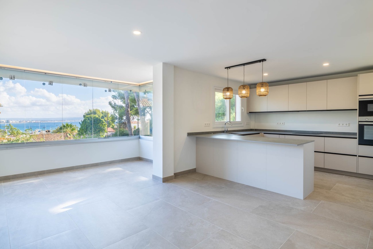 Er is ook een lichte, open woon-eetkamer en een moderne keuken met geïntegreerde apparatuur van waaruit je kunt genieten van een indrukwekkend uitzicht op de baai van Palma.
