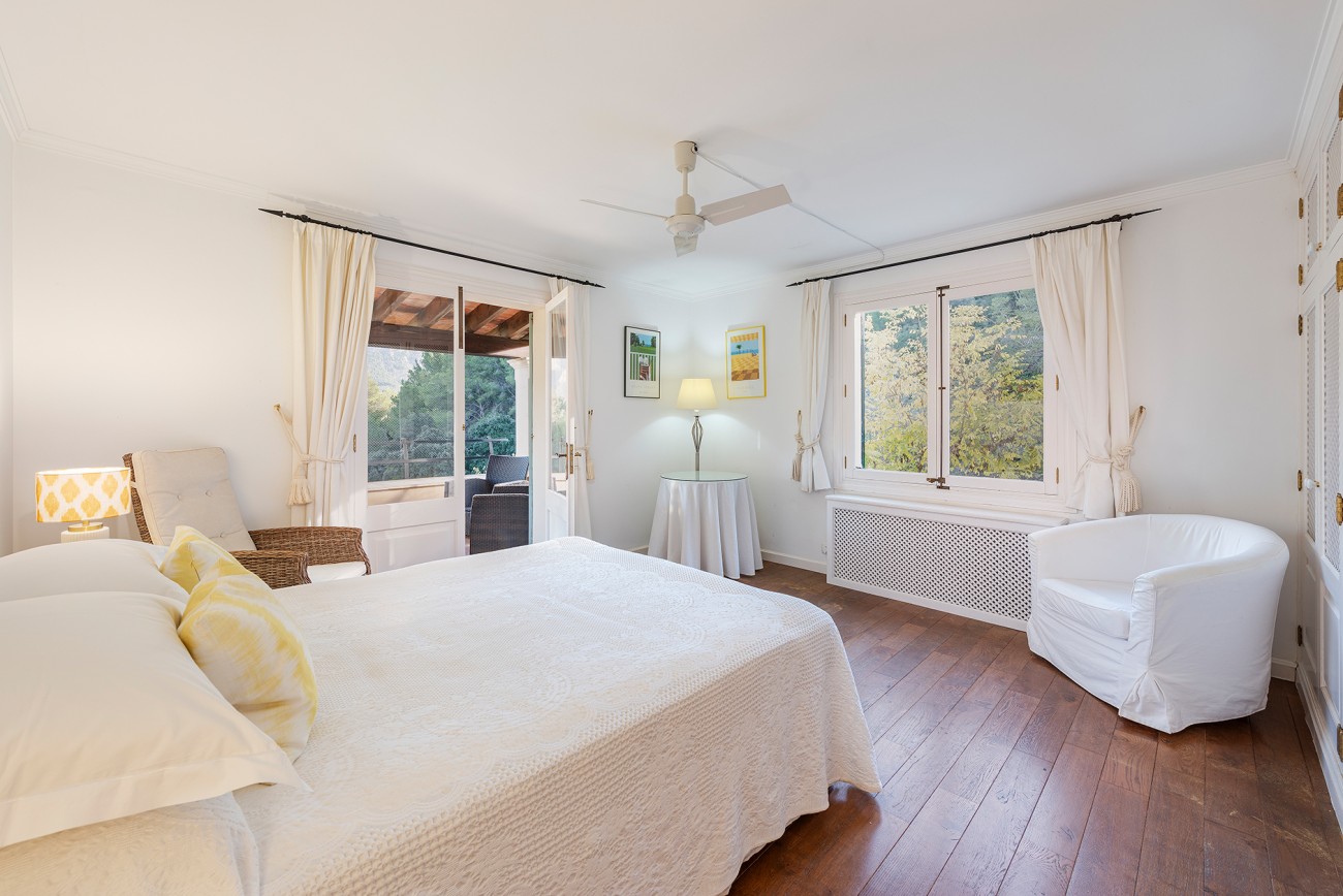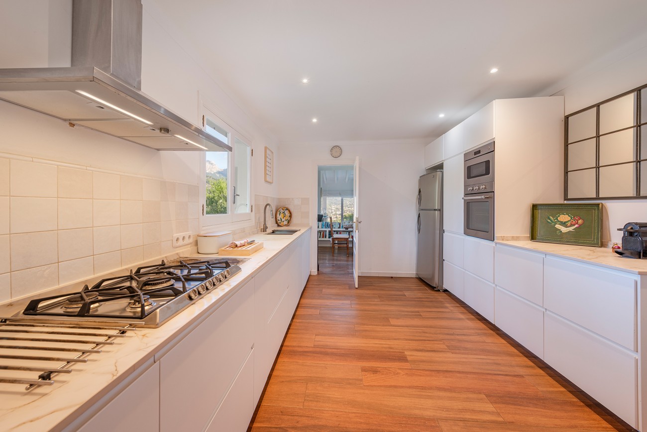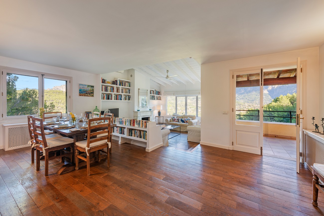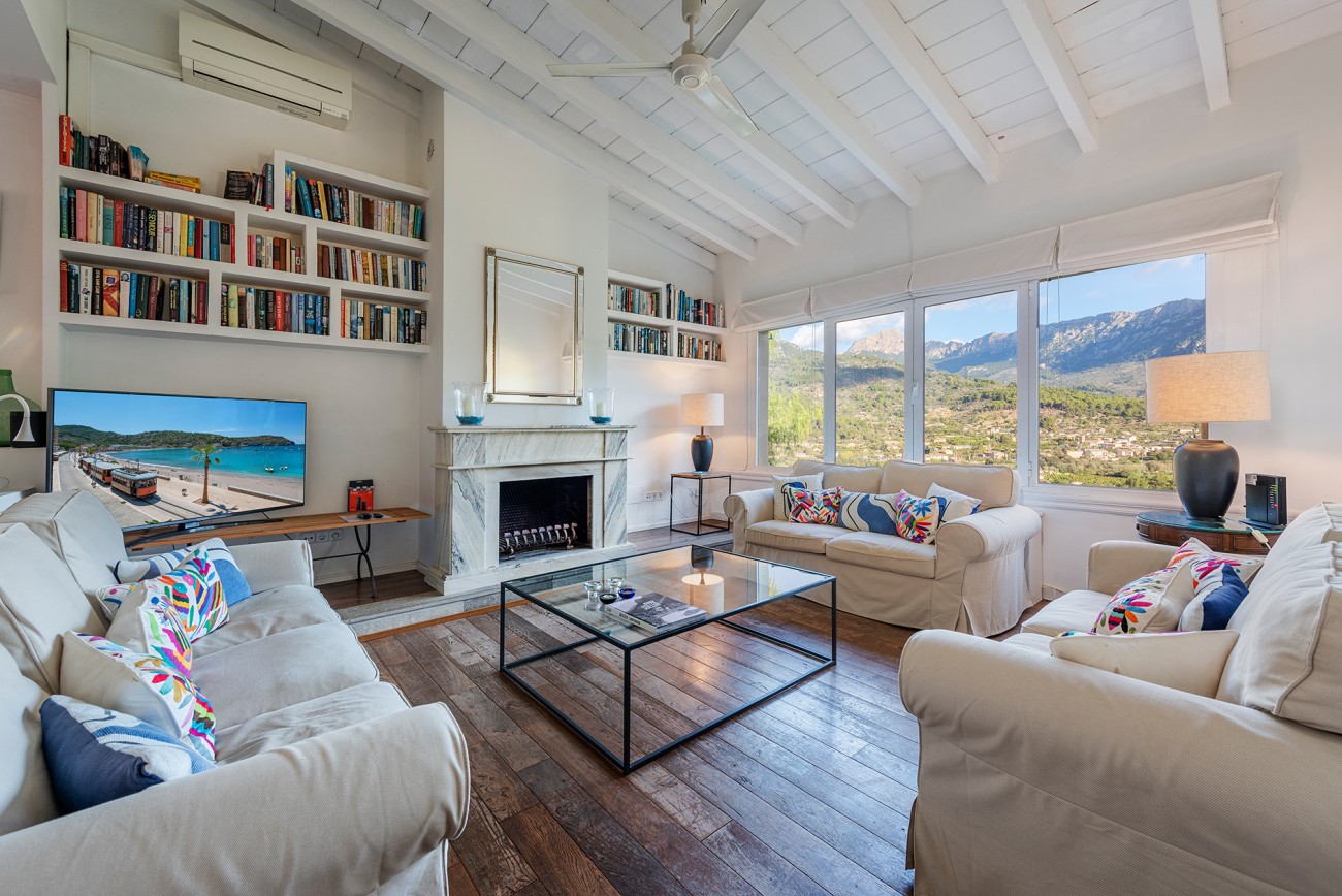 Binnen zijn frisse en karaktervolle interieurs een mix van parketvloeren, witgekalkte muren en traditionele balkenplafonds. De ruime woonkamer geeft direct toegang tot een overdekt terras waar het prachtige Tramuntana-gebergte een steeds veranderende achtergrond vormt.