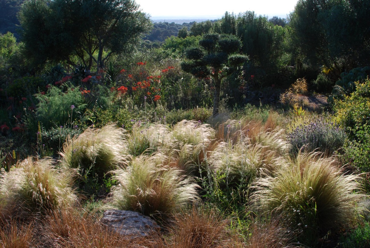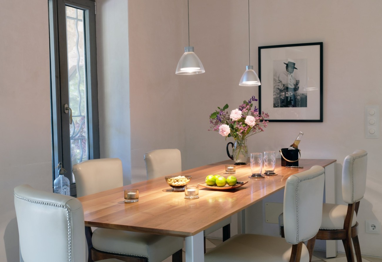 De woonkamer leidt naar een overdekt terras op het westen, perfect om te ontspannen, terwijl voor de keuken een eetterras op het zuiden ligt, compleet met een met bloemen overdekte pergola.