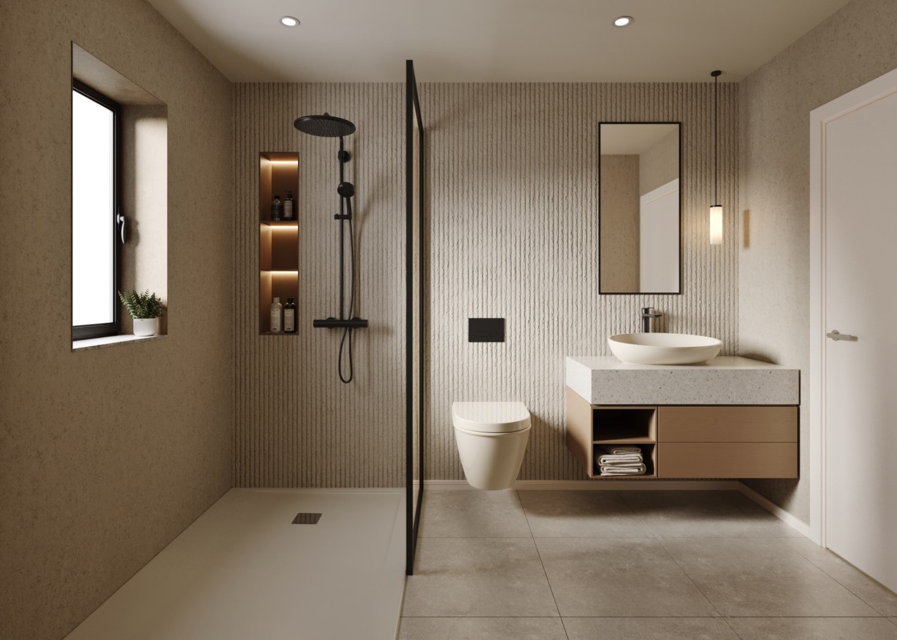 Elk huis heeft twee verdiepingen en op de begane grond vind je een open indeling met woon-eetkamer en een speciale ruimte voor de keuken, die niet is inbegrepen maar apart kan worden gekocht naar eigen smaak. Deze verdieping heeft ook een slaapkamer, gastentoilet en toegang tot de patio en terrassen.