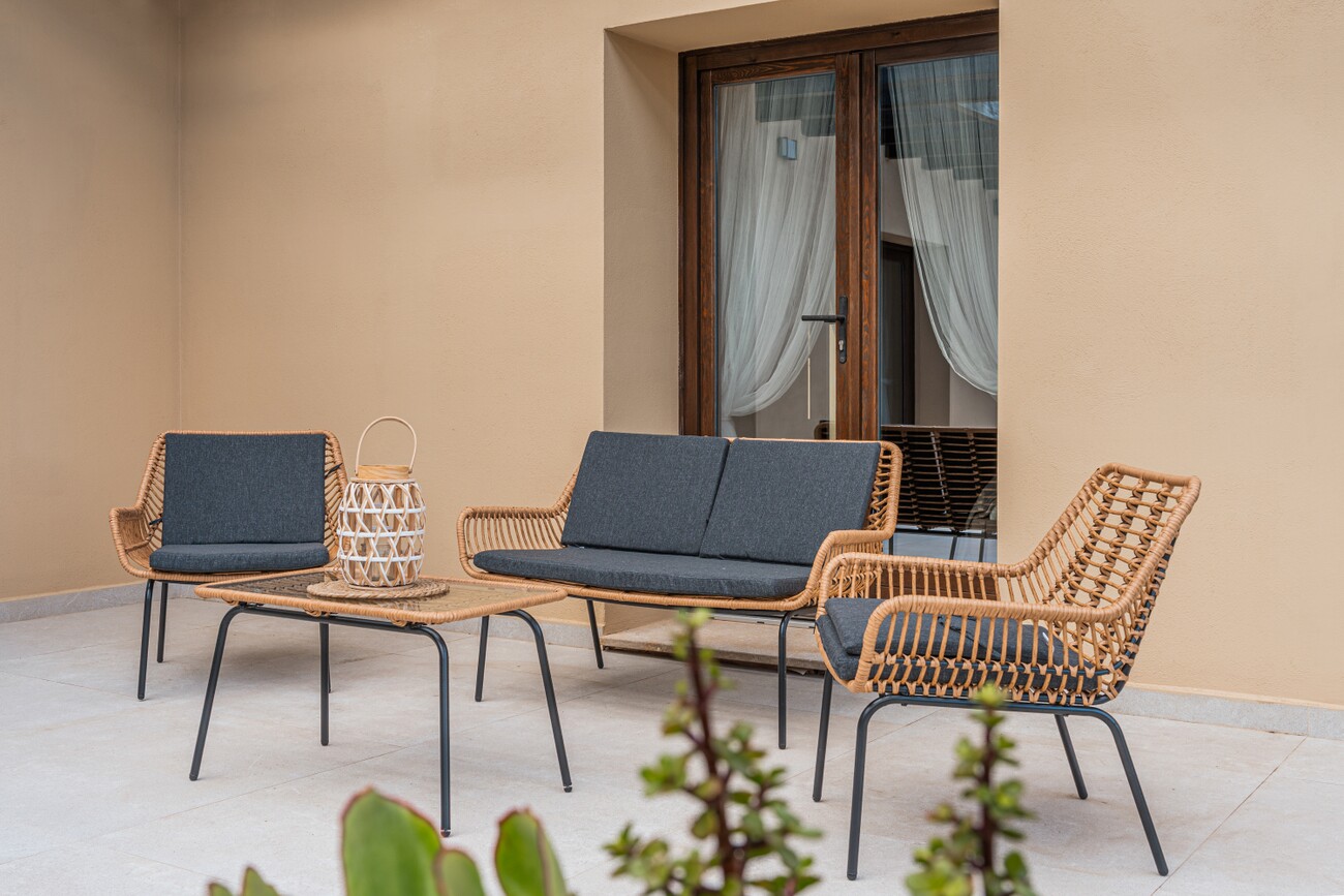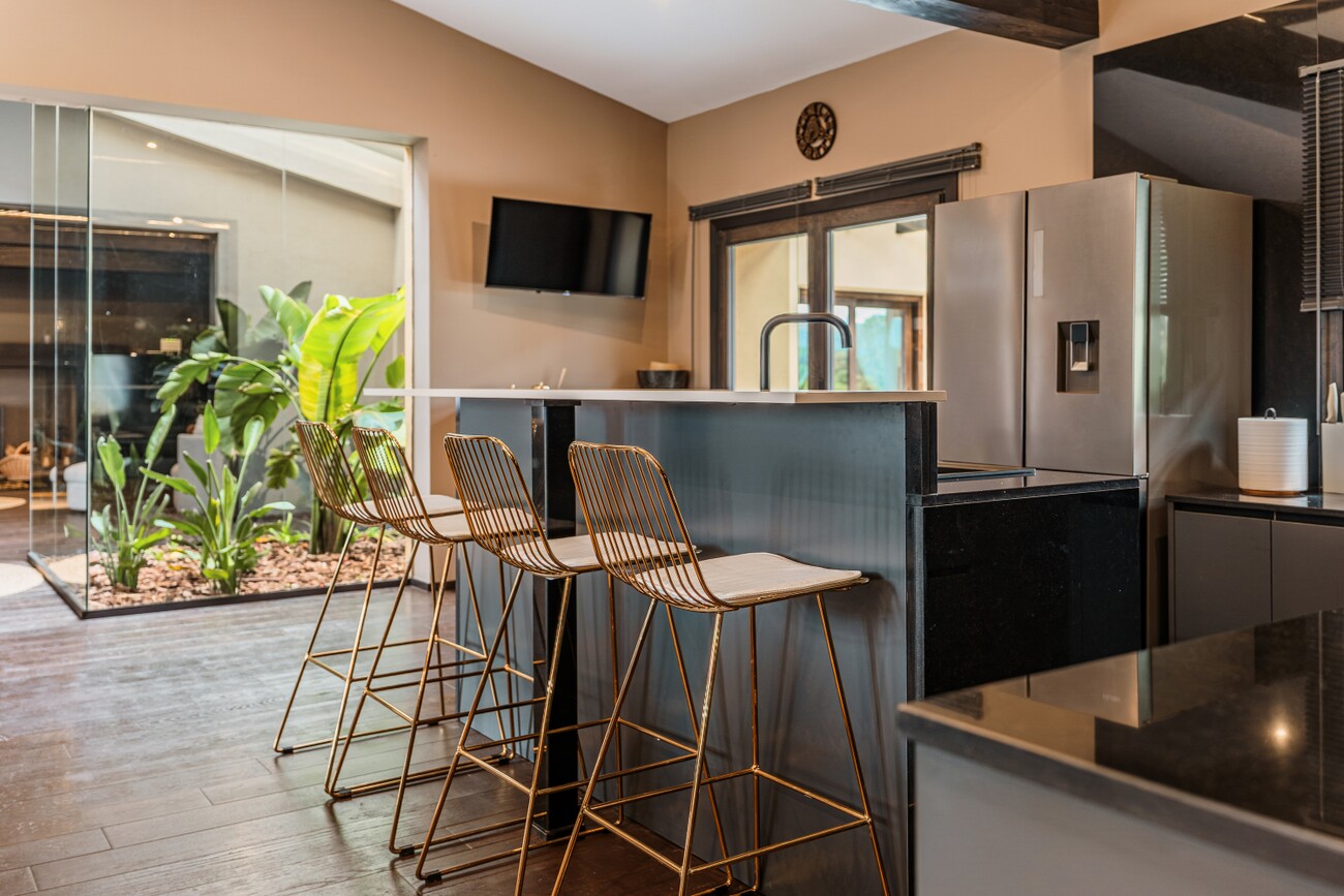 The single-storey home offers four double bedrooms, each with en-suite bathrooms and fitted wardrobes. The master bedroom features a walk-in dressing area, storage room, separate walk-in shower, and freestanding luxury bath. There is also an office area and utility room. The fourth bedroom is ideal for guests, with its own en-suite and private terrace overlooking manicured gardens.