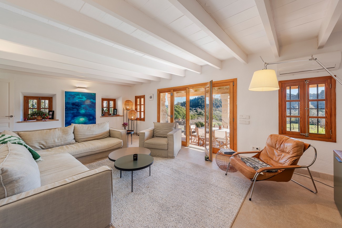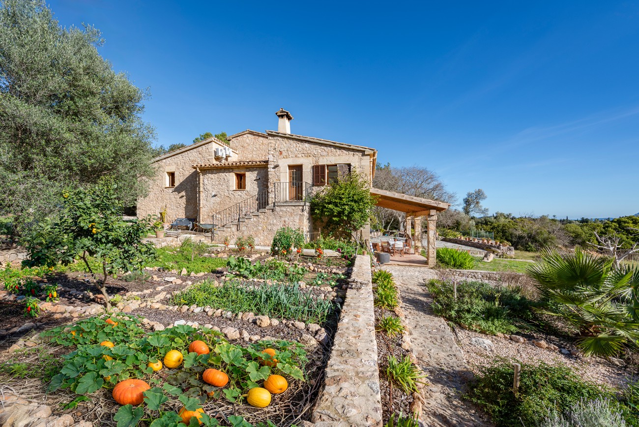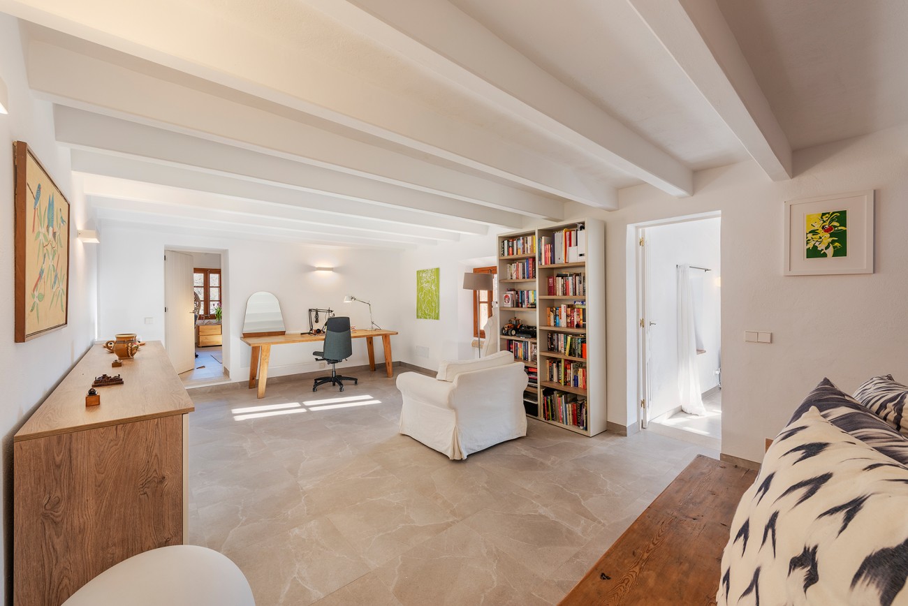 Met een bebouwde oppervlakte van ongeveer 450 m² heeft de finca klassieke natuurstenen gevels, houten balken en royale, lichte woonruimtes. De begane grond bestaat uit een elegante hal, een ruime woon- en eetkamer die uitkomt op een groot, overdekt terras, een volledig uitgeruste moderne keuken met kookeiland, een slaapkamer en een gastenbadkamer. De eerste verdieping biedt vier tweepersoonsslaapkamers, waarvan twee met eigen badkamer, een extra familiebadkamer en een speciale kantoorruimte.