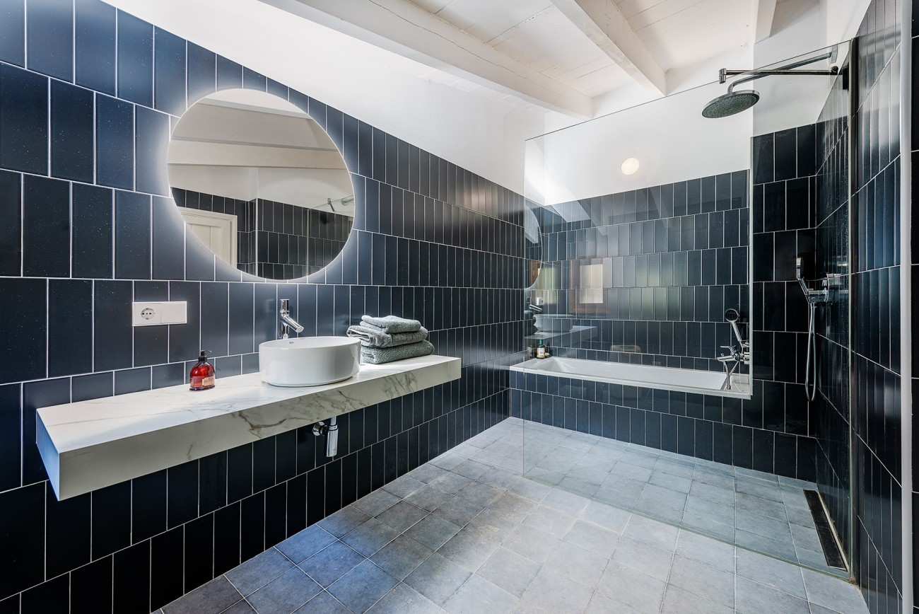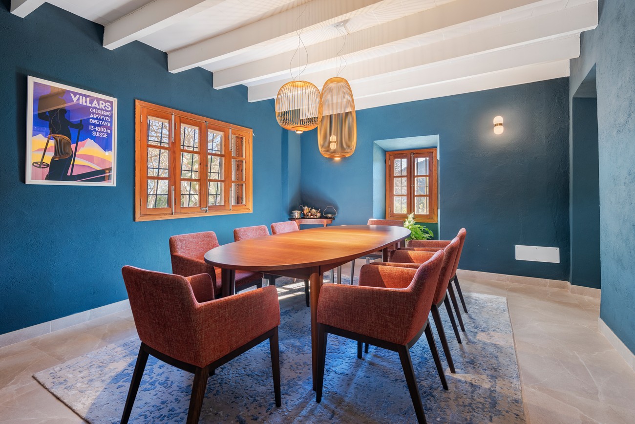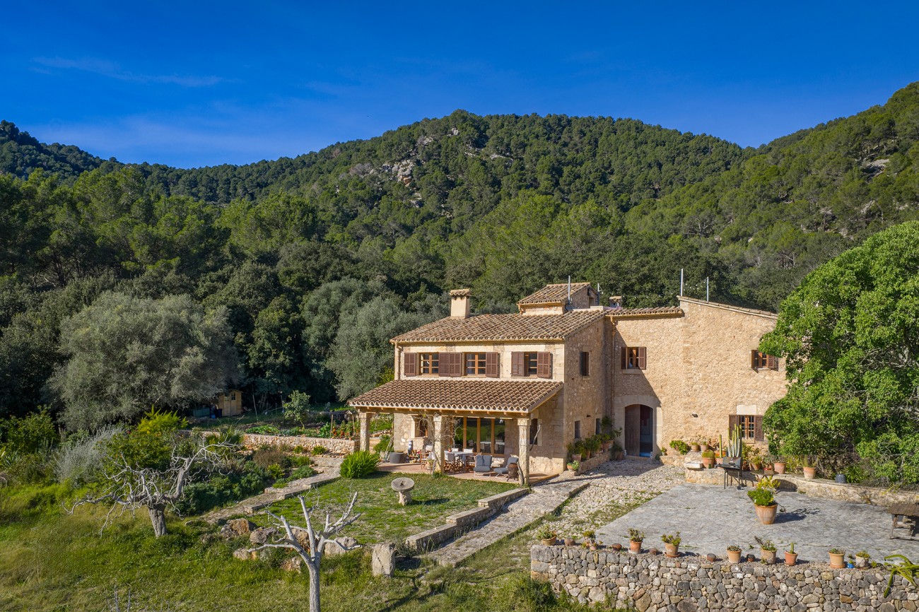 Met een bebouwde oppervlakte van ongeveer 450 m² heeft de finca klassieke natuurstenen gevels, houten balken en royale, lichte woonruimtes. De begane grond bestaat uit een elegante hal, een ruime woon- en eetkamer die uitkomt op een groot, overdekt terras, een volledig uitgeruste moderne keuken met kookeiland, een slaapkamer en een gastenbadkamer. De eerste verdieping biedt vier tweepersoonsslaapkamers, waarvan twee met eigen badkamer, een extra familiebadkamer en een speciale kantoorruimte.
