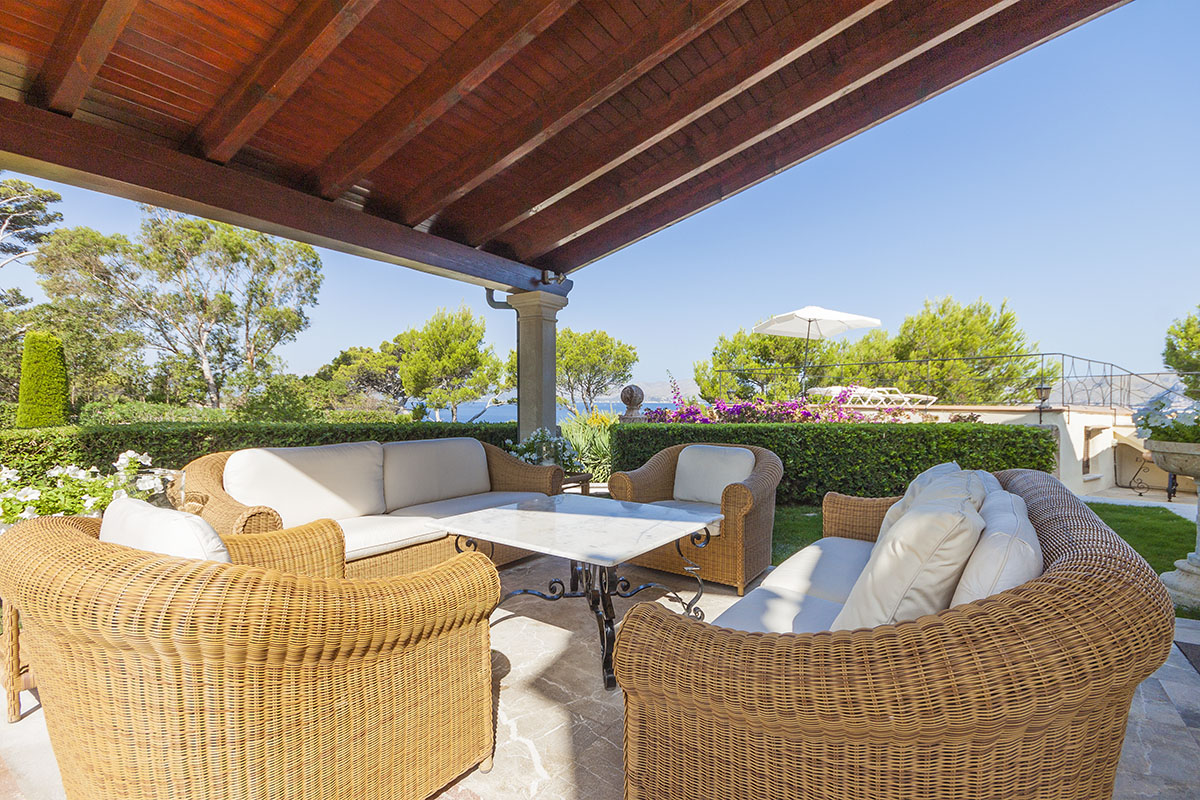 De verschillende terrassen zijn ideaal om buiten te dineren of gewoon te ontspannen met vrienden terwijl je geniet van het adembenemende uitzicht op zee. Het grote zwembad is omringd door teakhouten vlonders en ligt in een onberispelijk onderhouden gazon. De tuin straalt een gevoel van openheid uit en is prachtig onderhouden. Een garage voor twee auto’s met aangrenzende opslagruimte voor tuingereedschap en een overdekte carport voor extra parkeergelegenheid liggen iets apart van de villa’s.
