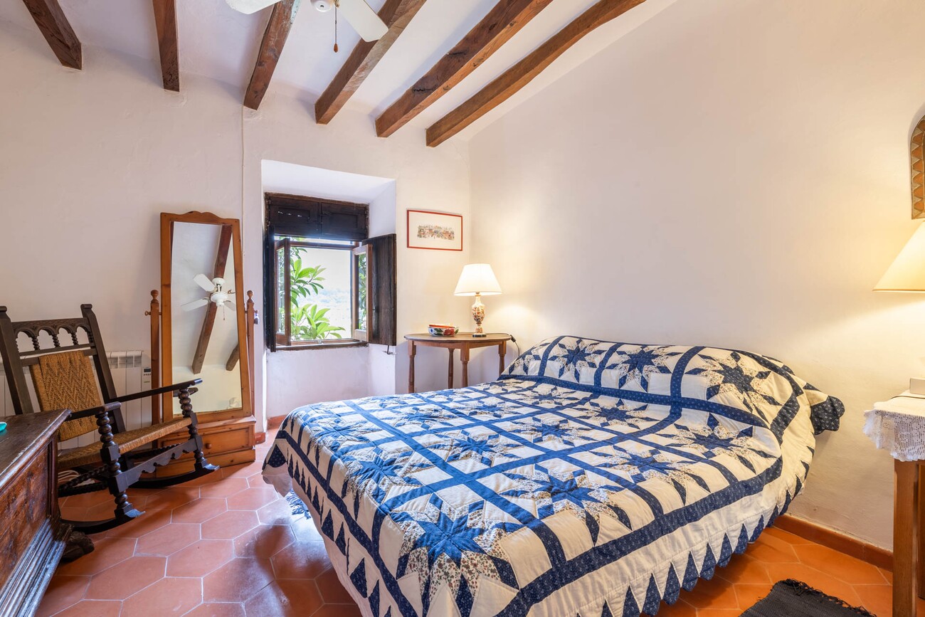 Op de begane grond vind je een rustieke keuken met ruimte om informeel te dineren die leidt naar het overdekte terras aan de achterkant. Er is een aparte formele eetkamer en een aparte bijkeuken met een gastentoilet. De woonkamer kan van buitenaf of via de keuken worden bereikt en er staat een houtkachel onder een traditionele Mallorquinse schoorsteenmantel. Er zijn ook twee tweepersoonsslaapkamers met een gedeelde doucheruimte naast de woonkamer.