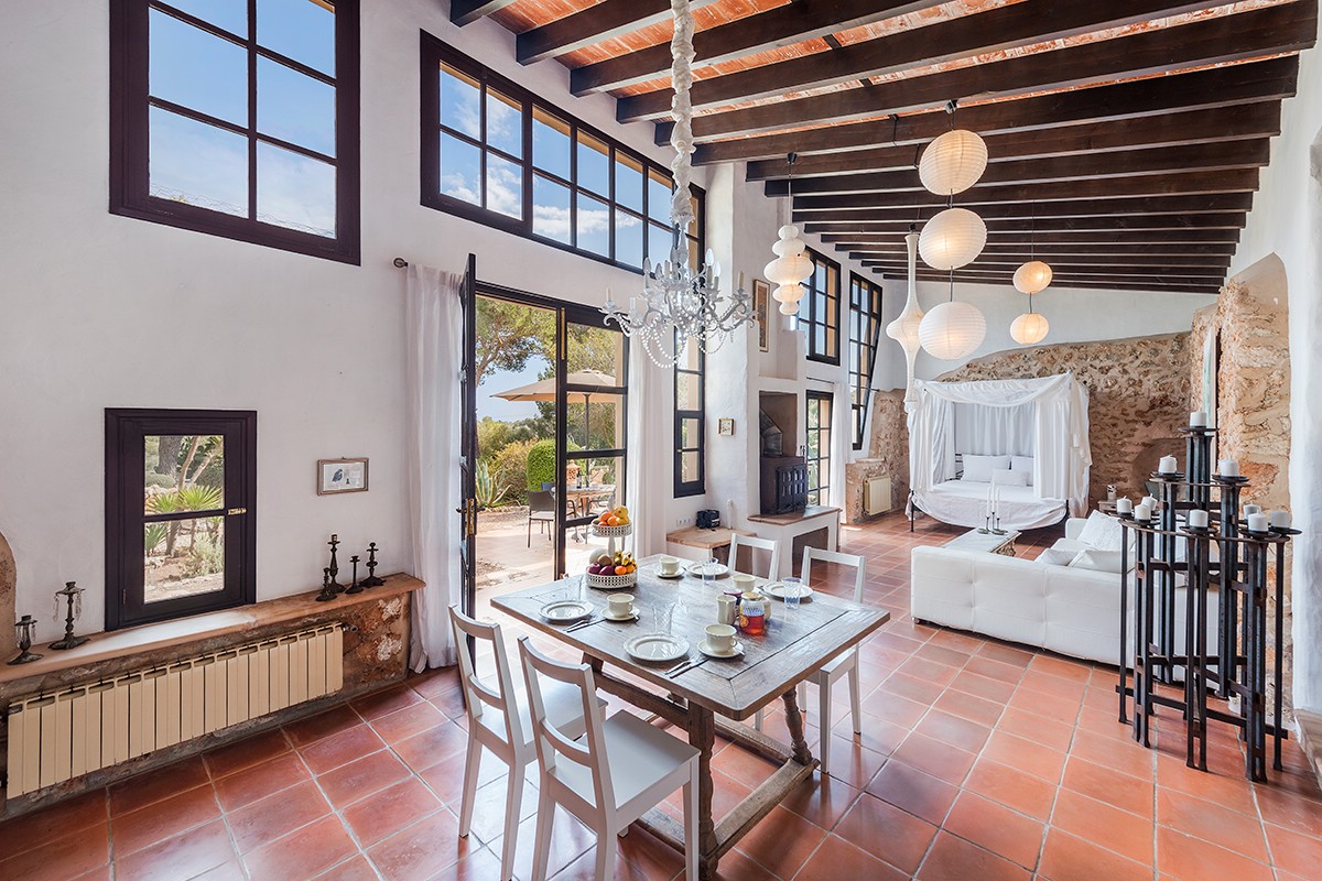 In het hoofdhuis leiden de ruime woon- en eetgedeeltes met open haard naar de open keuken en ook naar de prachtige zwembadterrassen en een overdekt chill-out terras met charmant meubilair. Hier is de BBQ en buiteneethoek met een traditionele houtoven – perfect om typische Mallorcaanse gerechten te bereiden. Vanaf hier leidt een veranda naar 2 slaapkamers waarvan één met badkamer en-suite en de andere met een aparte badkamer. De spectaculaire master suite is ook op de begane grond, met openslaande deuren naar het zwembadterras. Er is een jacuzzi geïnstalleerd in de vloer in het slaapgedeelte naast de en-suite badkamer, de master suite beschikt ook over een kleedkamer. Deze suite is ook verbonden met de torenkamer met prachtig uitzicht. Een tuinpad leidt naar een aparte loft met woon/eetgedeelte, een kitchenette, een slaapkamer met en-suite badkamer en een zonnig terras met uitzicht op zee. De 5e slaapkamer heeft een eigen ingang en een badkamer en-suite.