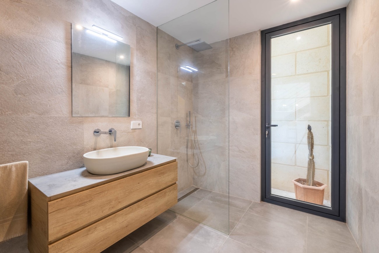 De ingang van het huis is op de eerste verdieping, waar je een mooie hal vindt met een trap naar de belangrijkste woonruimte en een andere trap naar het bovenste terras. Op dit middenniveau bevinden zich alle vier de slaapkamers; drie tweepersoonsslaapkamers die een badkamer delen, en een ouderslaapkamer met een eigen badkamer en inloopkast.