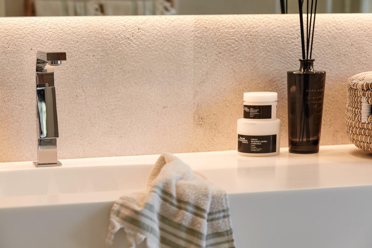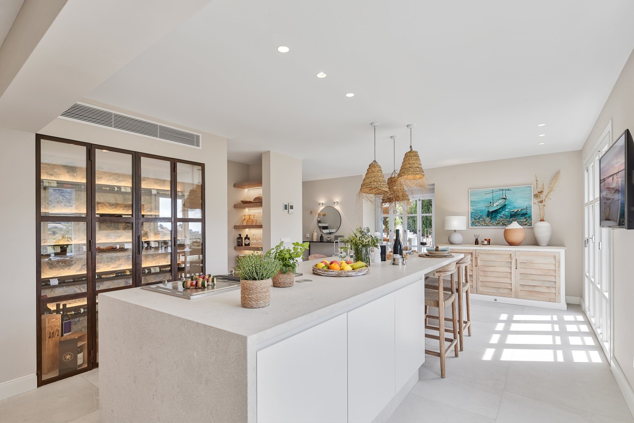 The stylishly fully renovated villa (2021) welcomes you with two elegant bedrooms, each featuring a luxurious en-suite bathroom. The layout is complemented by a third bedroom with bathroom/WC, located directly adjacent to the pool terrace, creating a particularly attractive retreat for guests or family members. Overall, the property offers an atmosphere of tranquility and security. Fine natural stone floors, a high-quality kitchen with its own wine bodega, and thoughtful details such as separate sanitary areas and custom-made built-in wardrobes emphasize the exclusive character of this residence.