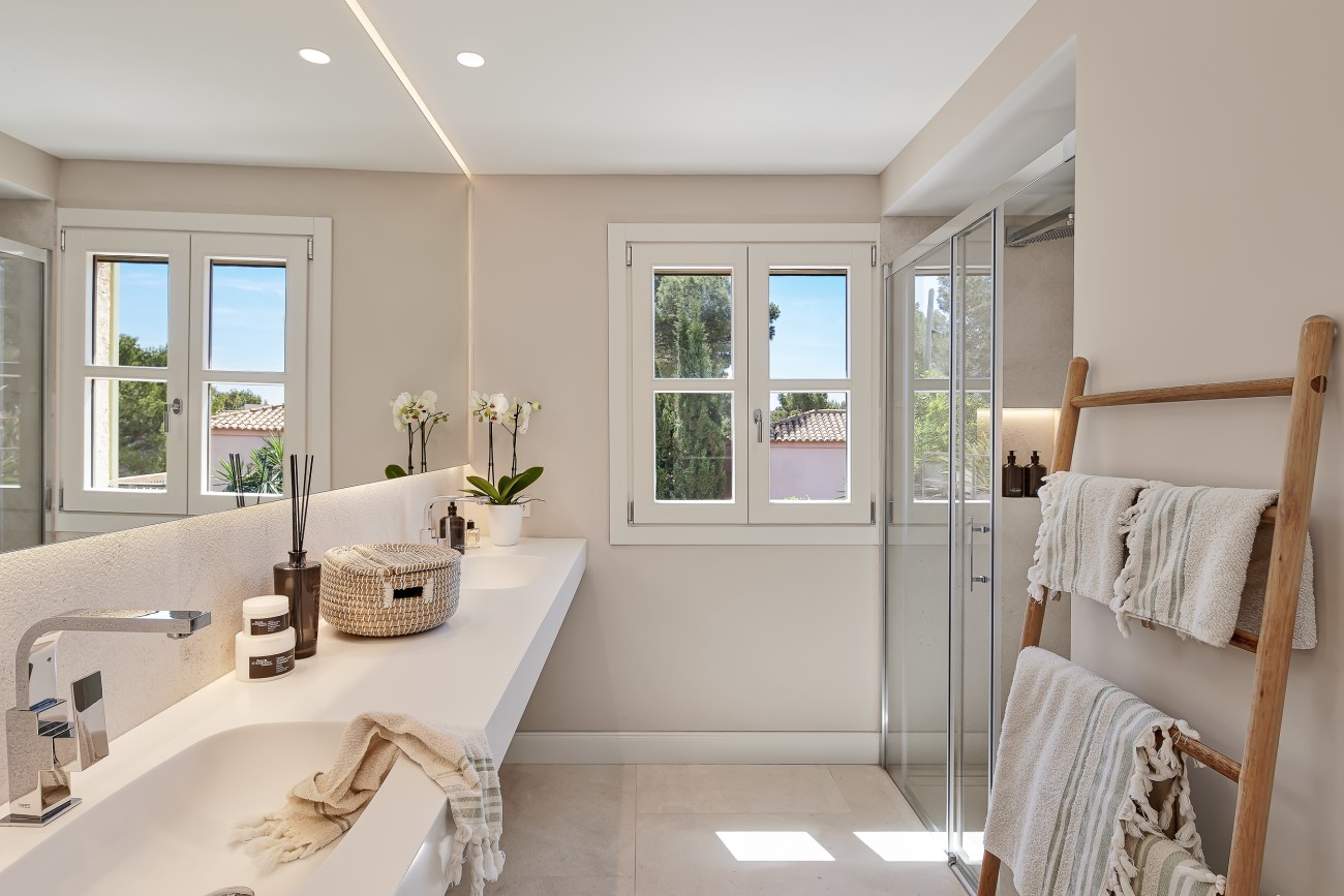 The secluded, beautifully landscaped garden is a true oasis of relaxation: the gently shimmering saltwater pool invites refreshing moments under the Mallorcan sun, while the fireplace in the living area creates a cozy ambiance on cooler evenings. Spacious living areas open harmoniously to the outdoors, allowing indoor and outdoor living to merge. Underfloor heating, air conditioning, reverse osmosis system, KNX smart home system, alarm system, and security door ensure maximum comfort and safety. A utility room, a garage, and an additional parking space complete this exceptional offering. The villa is handed over tastefully furnished – ready to move in and be enjoyed immediately.