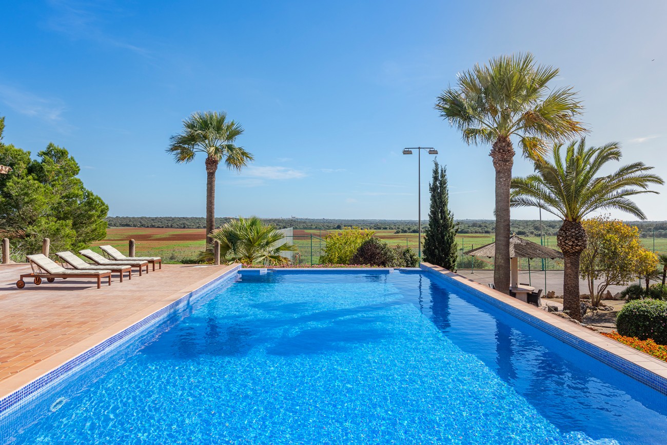 De buitenruimtes creëren een oase van rust: serene binnenplaatsen met een centrale fontein, uitgestrekte tuinen, een barbecueplaats met een traditionele houtoven en een indrukwekkend overloopzwembad. Extra voorzieningen zijn onder andere paardenstallen, een tennisbaan en uitgebreide overdekte parkeergelegenheid.
