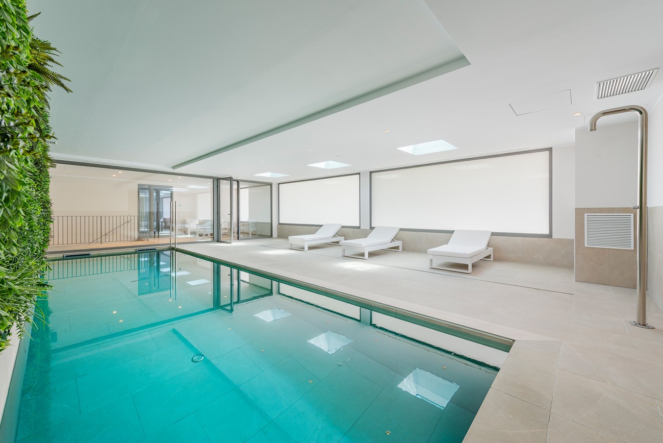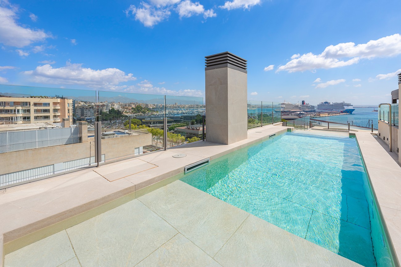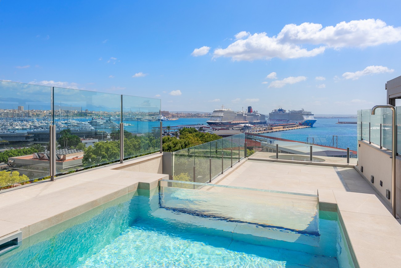 Dit prachtige penthouse te koop in Palma de Mallorca heeft fantastisch uitzicht, een zwembad, spa en sauna.