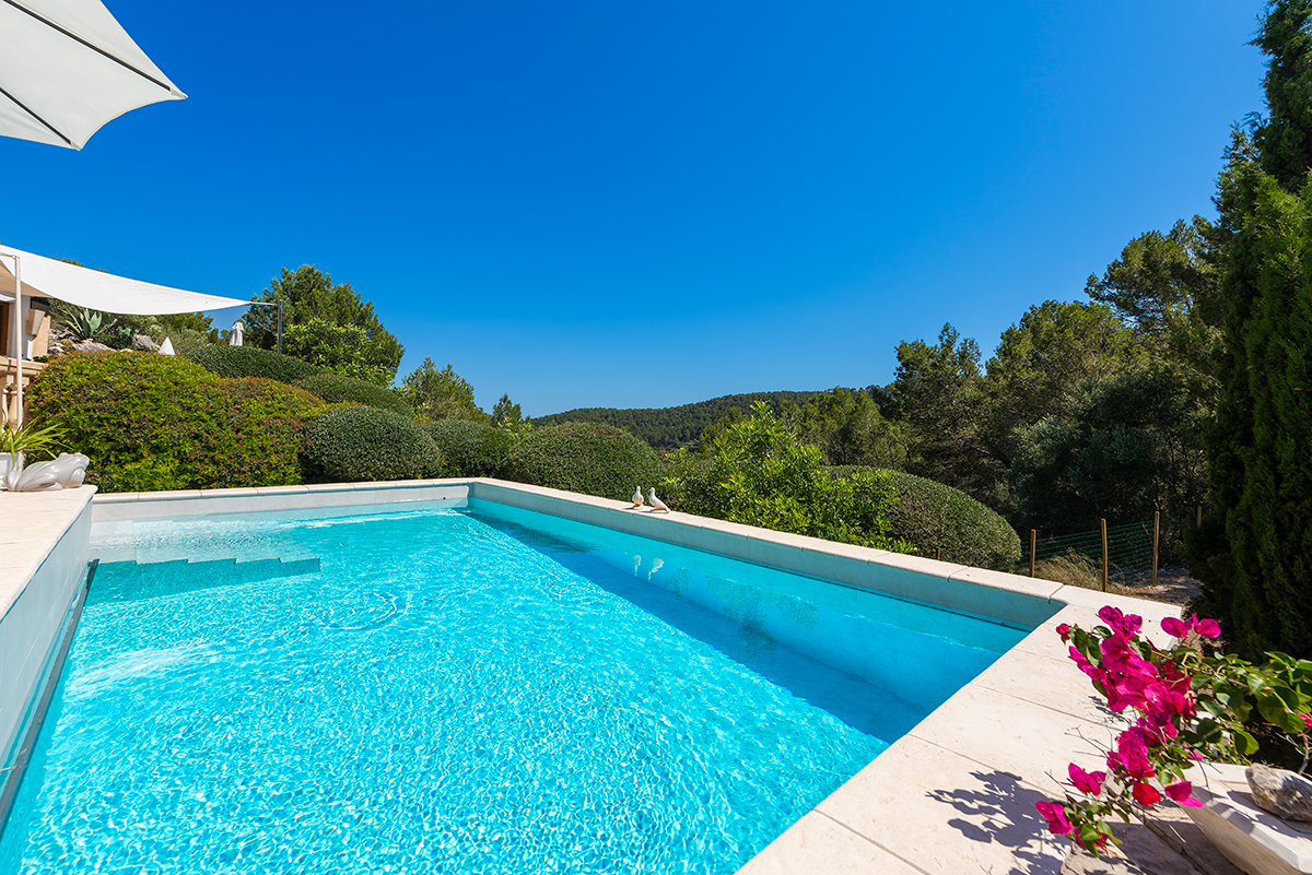Buiten is het pand omringd door een groot terrein met verzorgde tuinen met volgroeide planten en bomen, talloze terrassen en een nieuw betegeld zwembad met ligweide met uitzicht over de vallei.